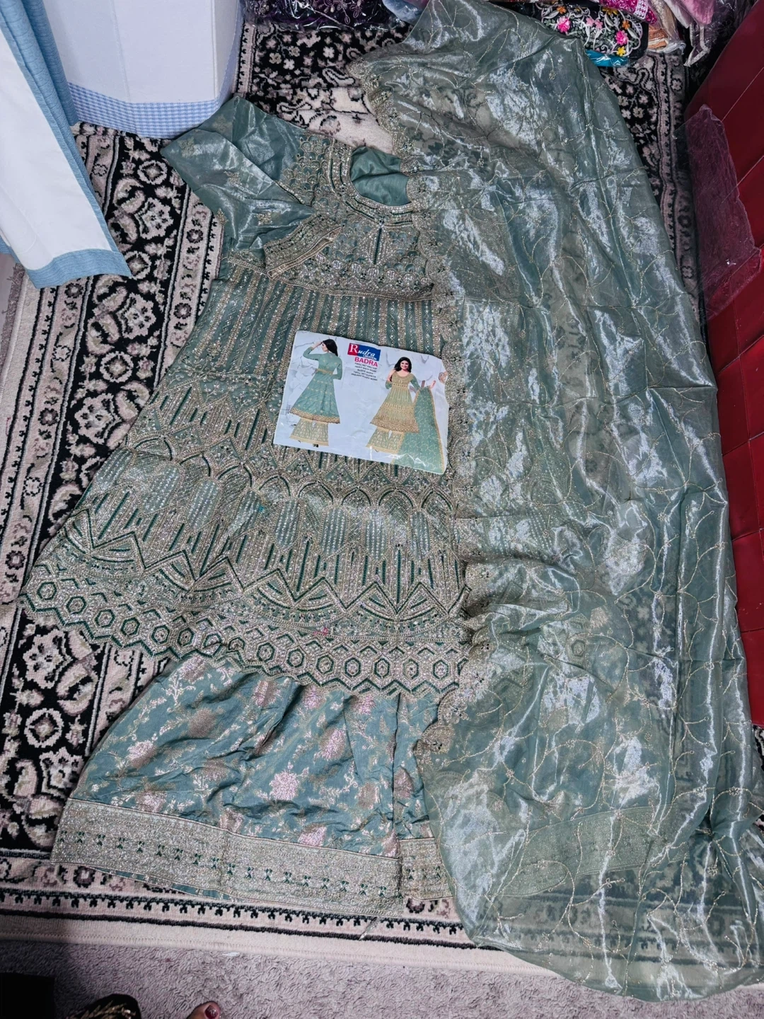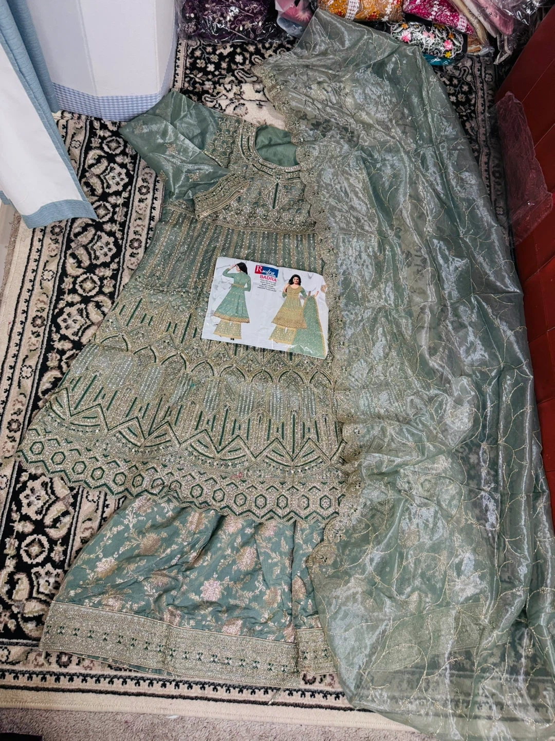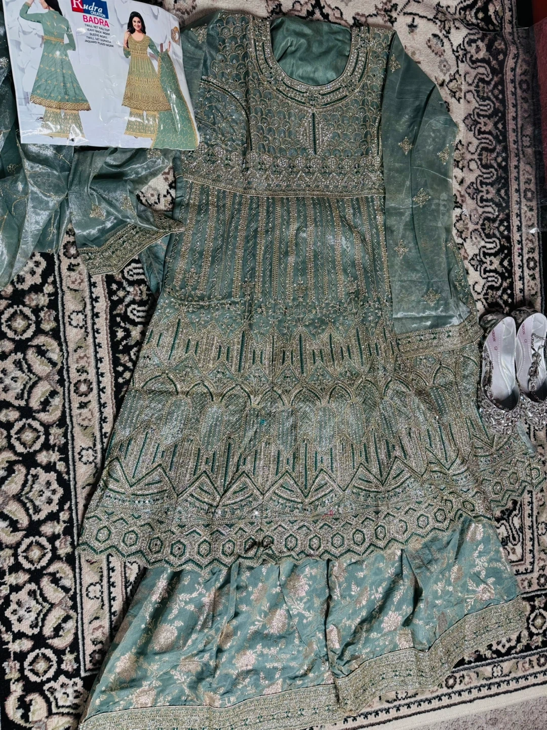 Brand New This Rudra BADRA maxi dress is a beautiful sage green colour with intricate gold embroidery. It comes with a matching dupatta. The dress is adorned with detailed patterns and sequins throughout. It's perfect for special occasions!