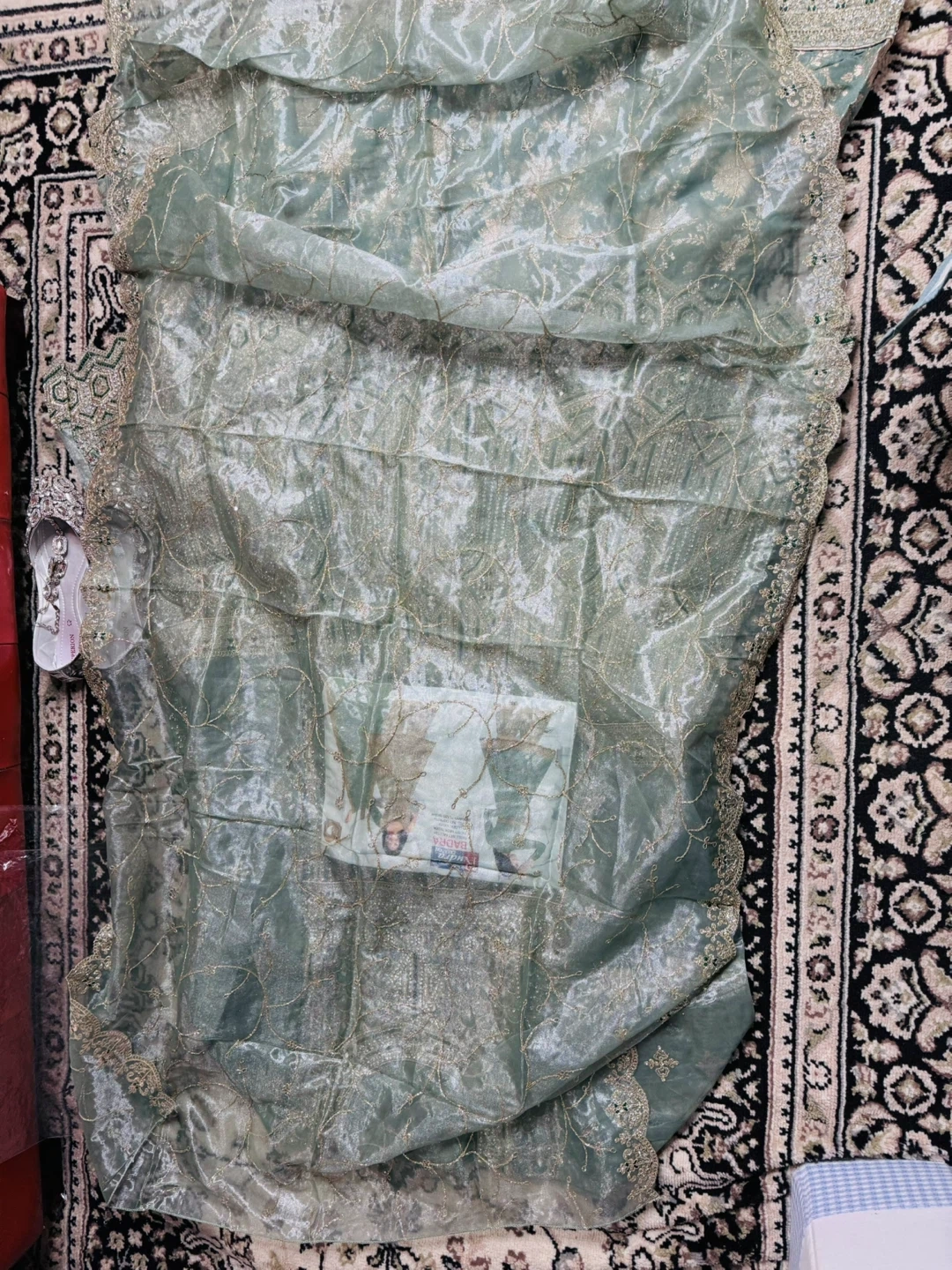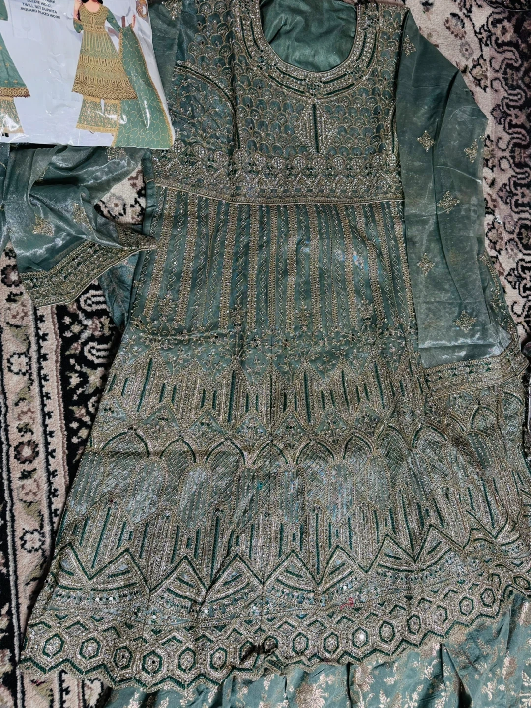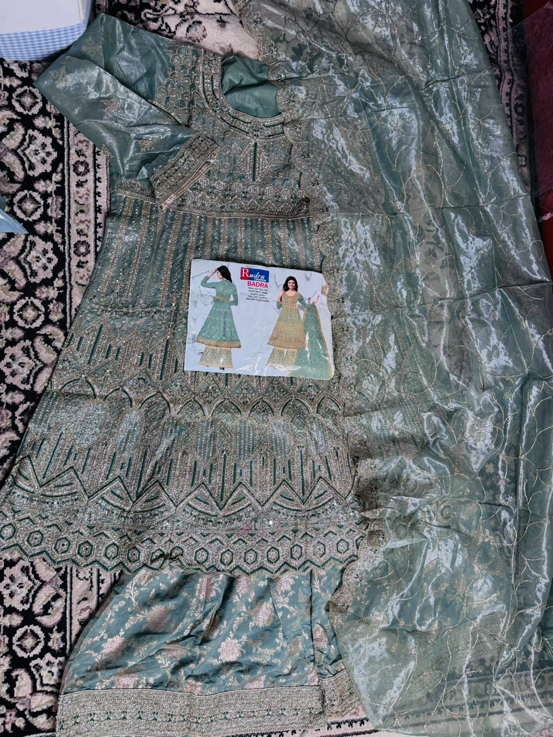 Brand New This Rudra BADRA maxi dress is a beautiful sage green colour with intricate gold embroidery. It comes with a matching dupatta. The dress is adorned with detailed patterns and sequins throughout. It's perfect for special occasions!