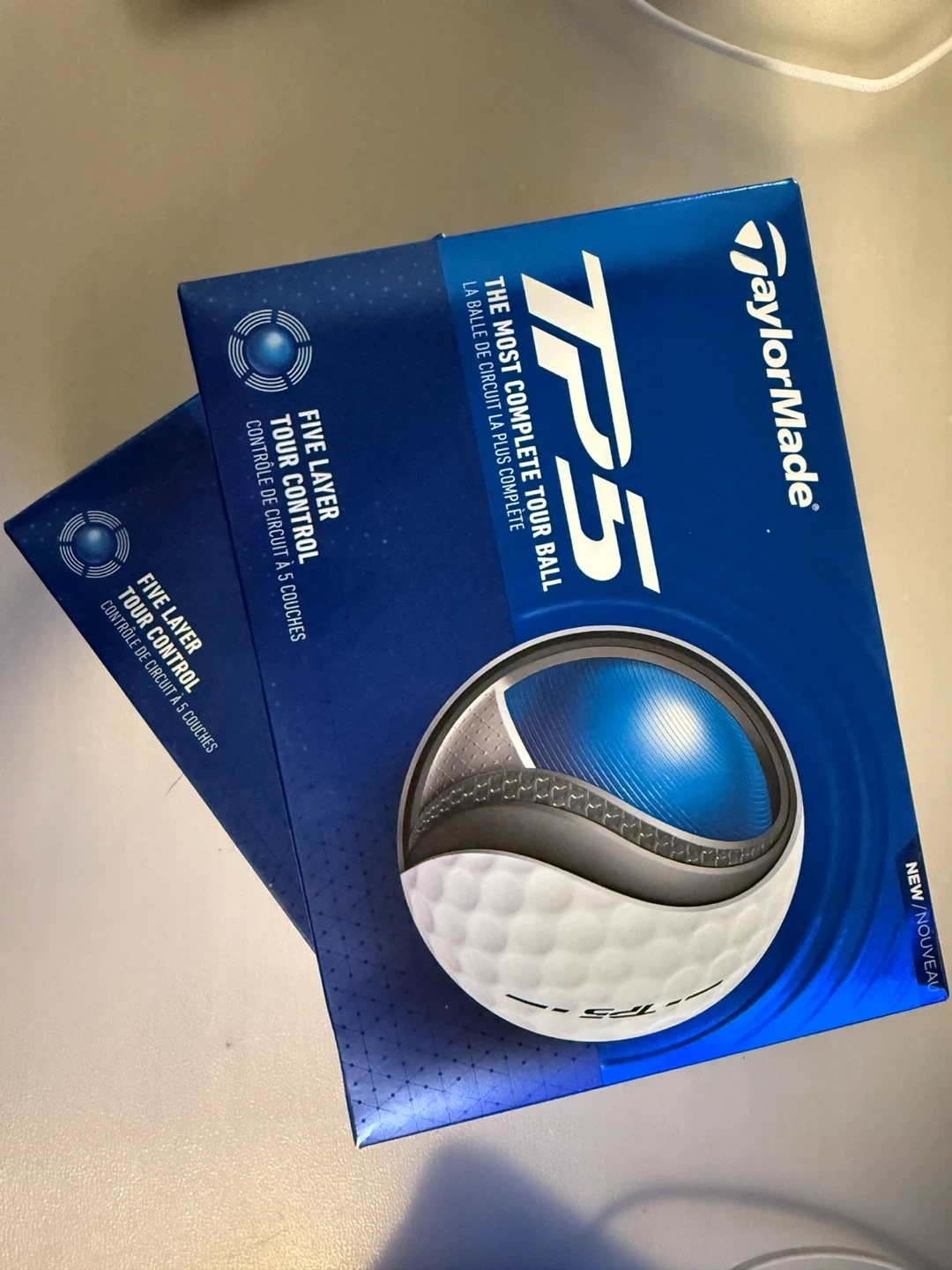 Two boxes of TaylorMade TP5 golf balls. Each box contains 12 urethane golf balls. These are five-layer tour balls with tour control.