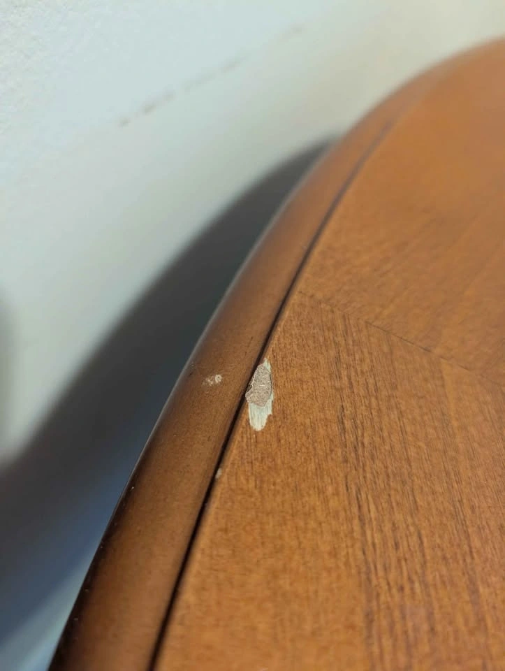 There is a stain and minor chips on the table surface (see photos). Other than that, it's in good shape. This will work for you if you use a table cloth.