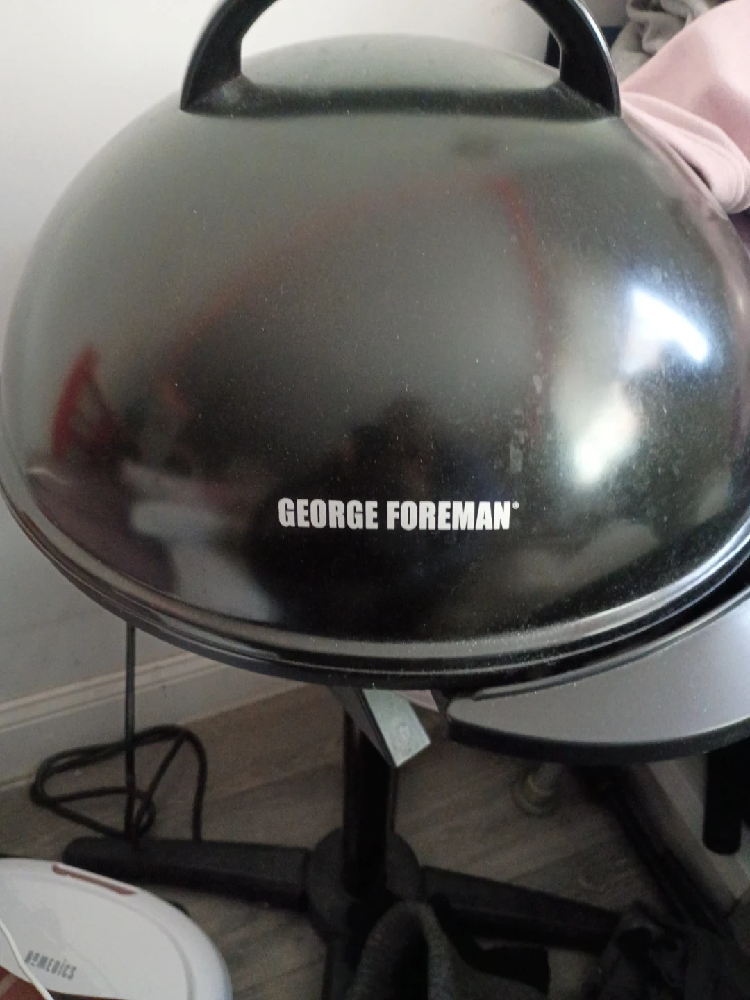This is a George Foreman indoor/outdoor electric grill. It has a round grilling surface with non-stick coating. The grill is black and comes with a lid.