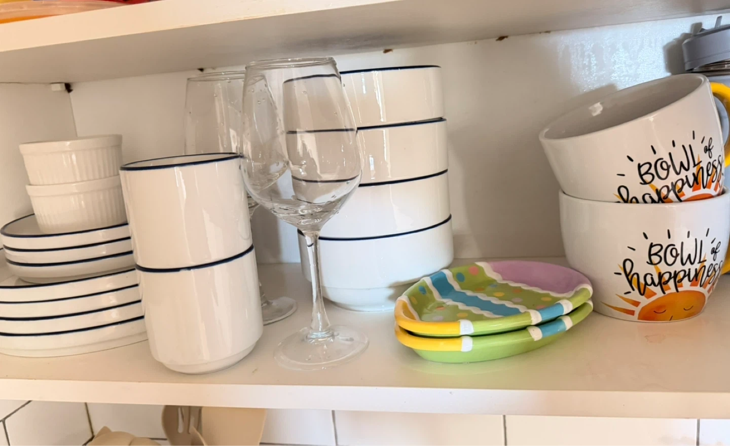 This set includes white ceramic bowls and cups with a blue rim detail. There are also two white ramekins and a stack of white plates with blue stripes. The cups have a "bowl of happiness" design with a sun graphic. All pieces are made of ceramic.