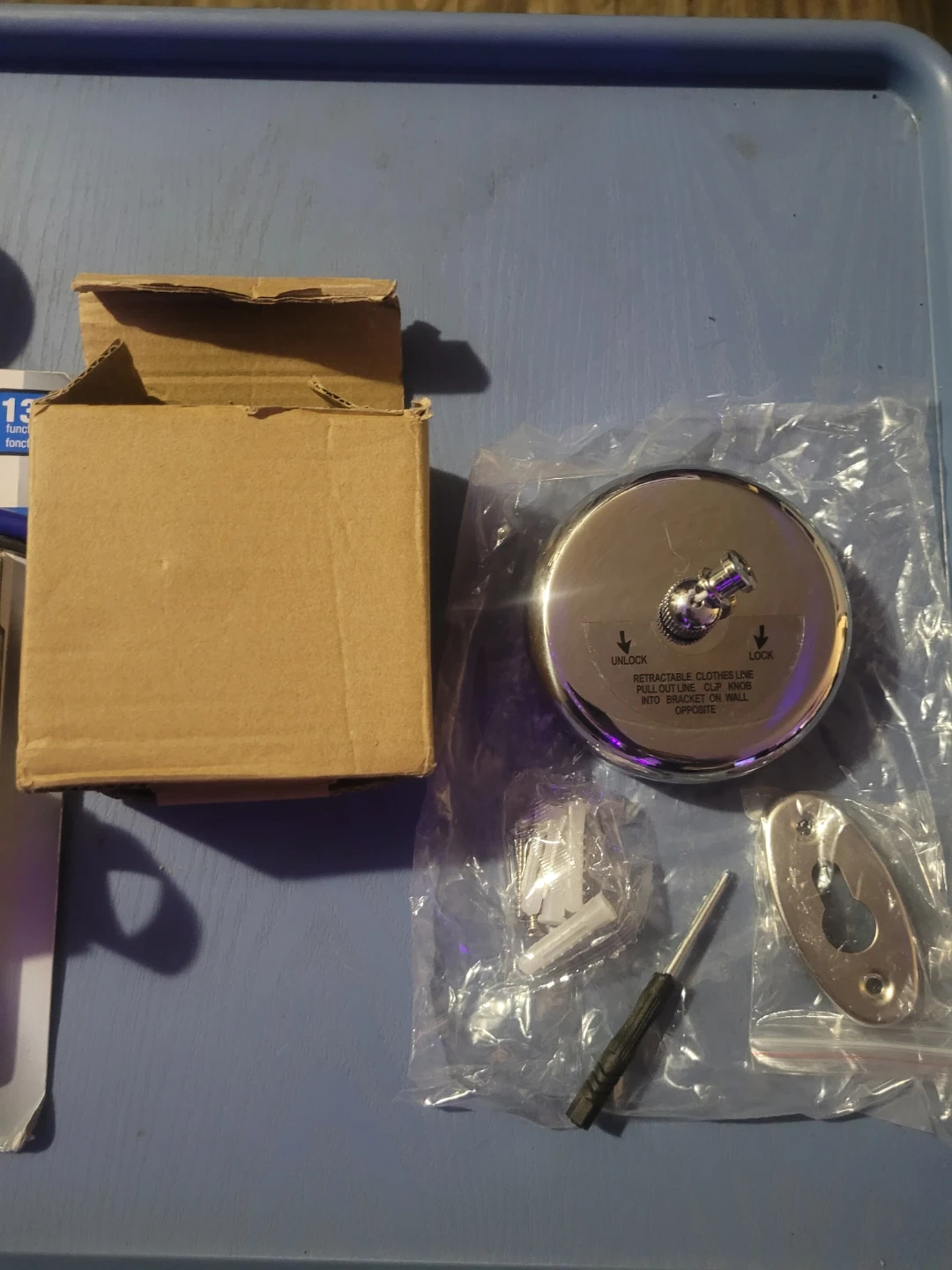 Retractable clothesline. Install on wall bracket (included). Brand new, bought shortly before I moved out of a mobile home.
