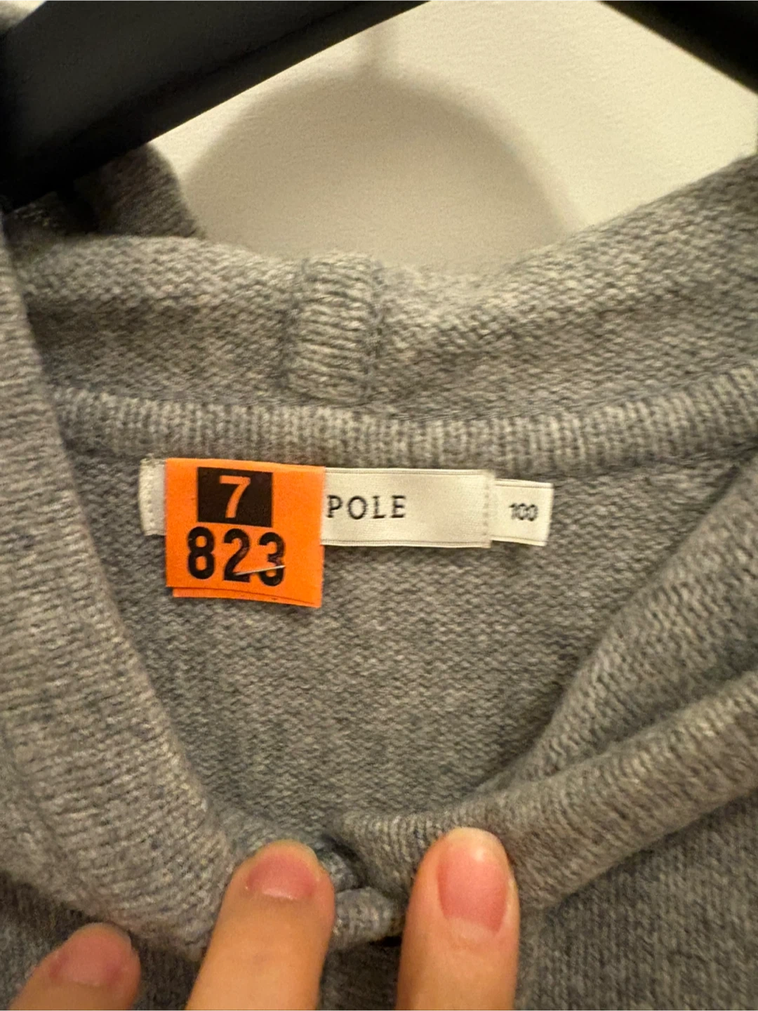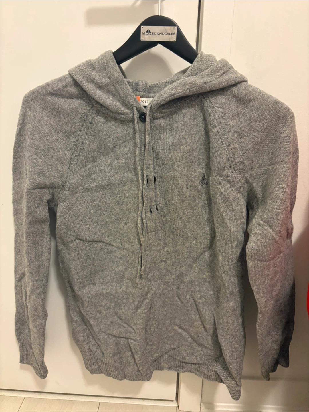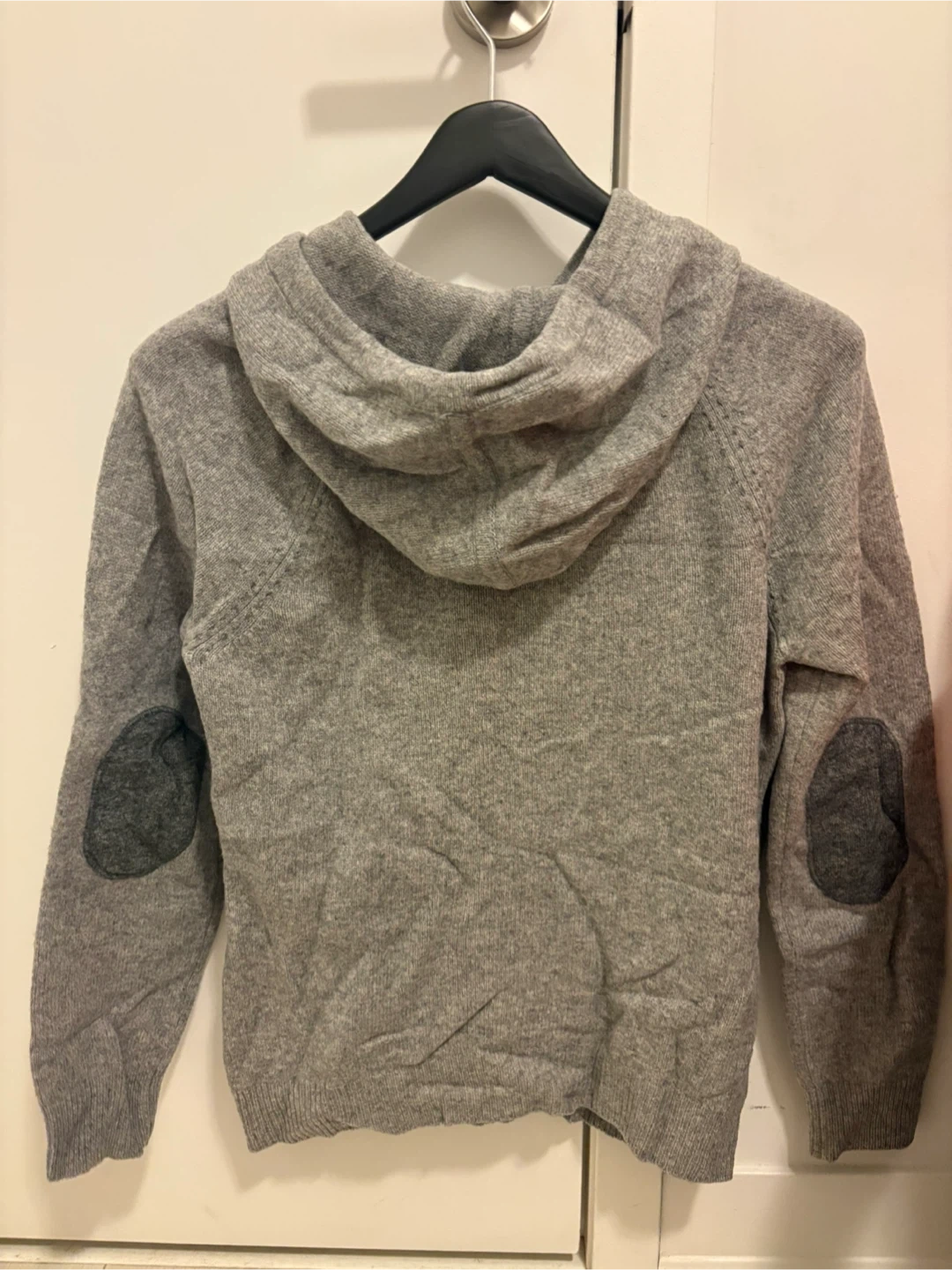 Selling a gently used beanpole knit hoodie in size L. It's a soft grey colour and has a hood. The material is 100% wool. It also has elbow patches!