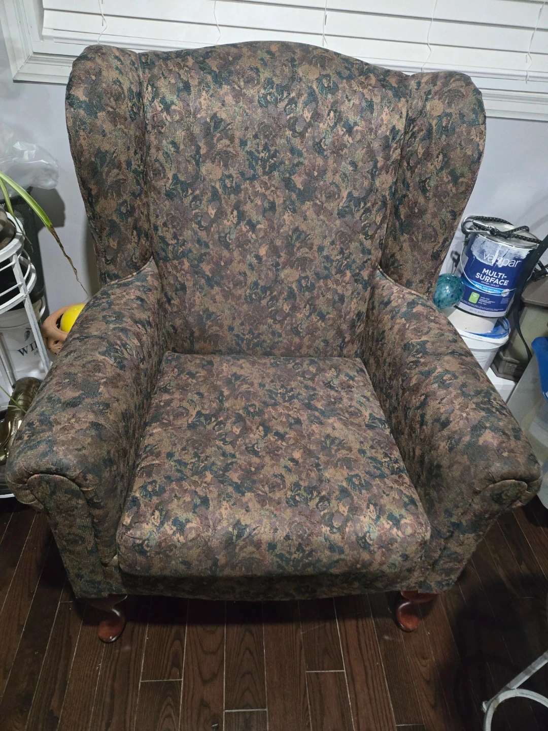 This is a comfortable wingback armchair with a floral pattern. It has a sturdy wooden frame and upholstered fabric. It's perfect for a cozy reading nook. Price for one i have 2 of the chairs.