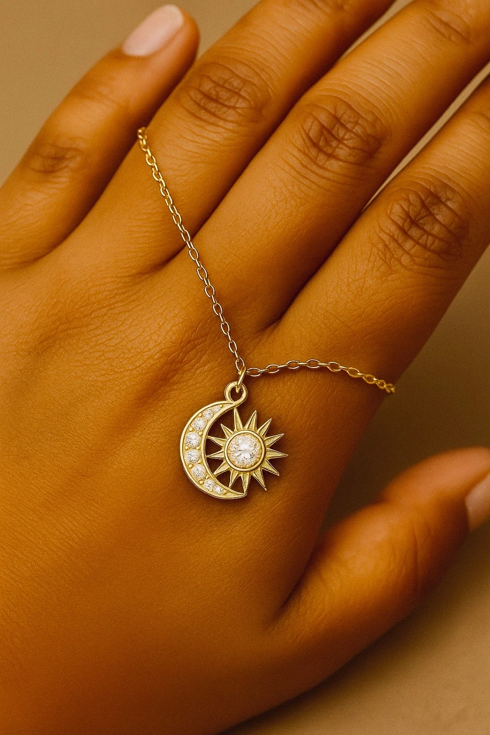 A dainty gold necklace that shines day and night! Featuring a radiant sun and moon pendant, it’s the perfect balance of everyday charm. Wear it to elevate your daily look or add a touch of sparkle to any outfit