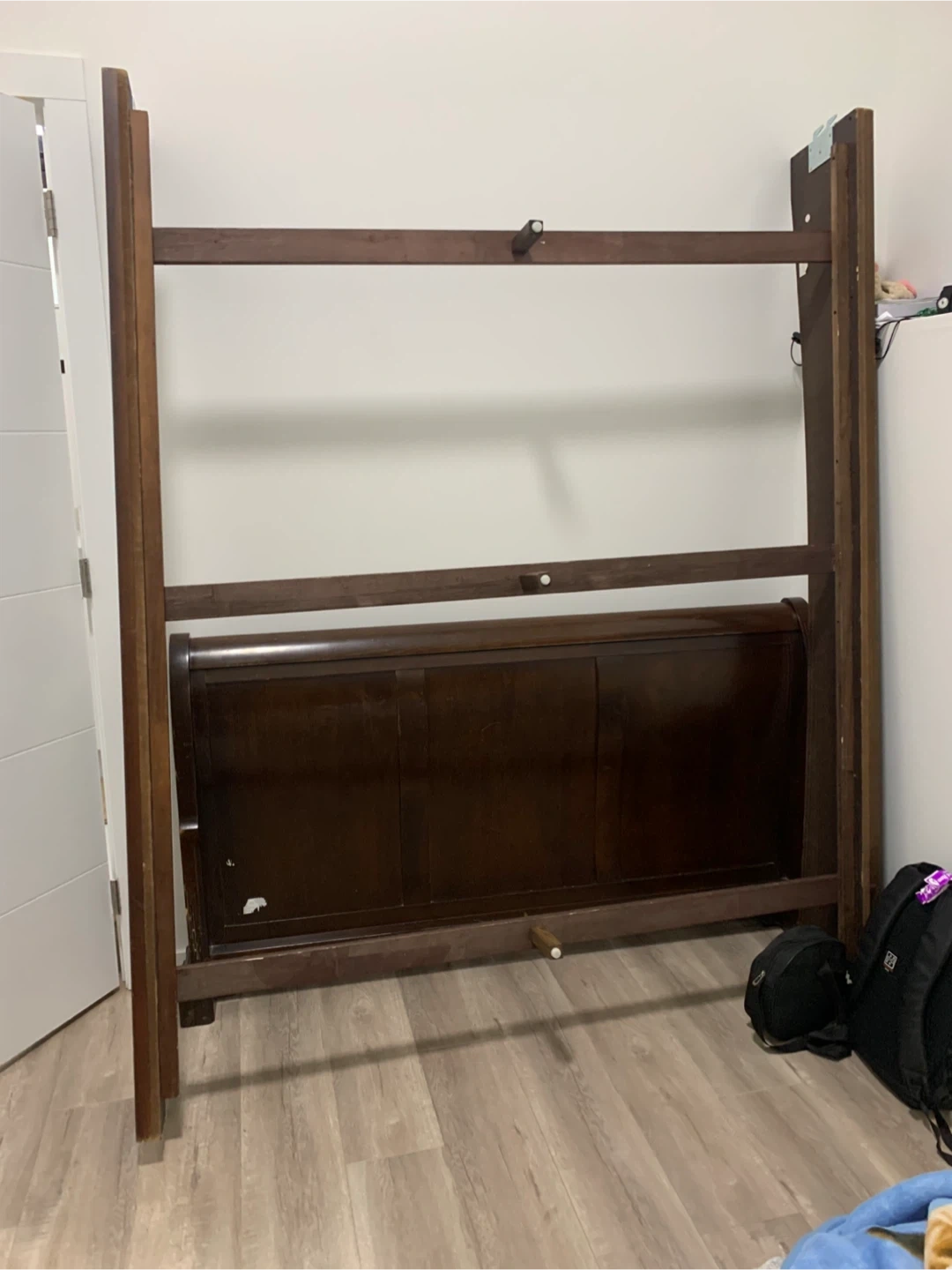 Selling a dark brown queen size bed frame. It's in good condition and ready to go to a new home! Perfect for any bedroom. Price is also negotiable