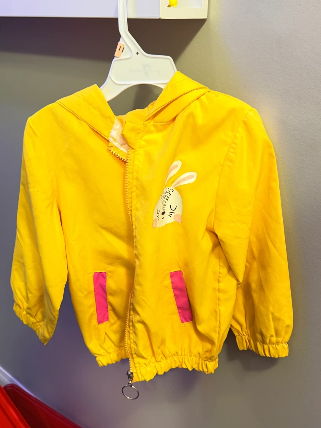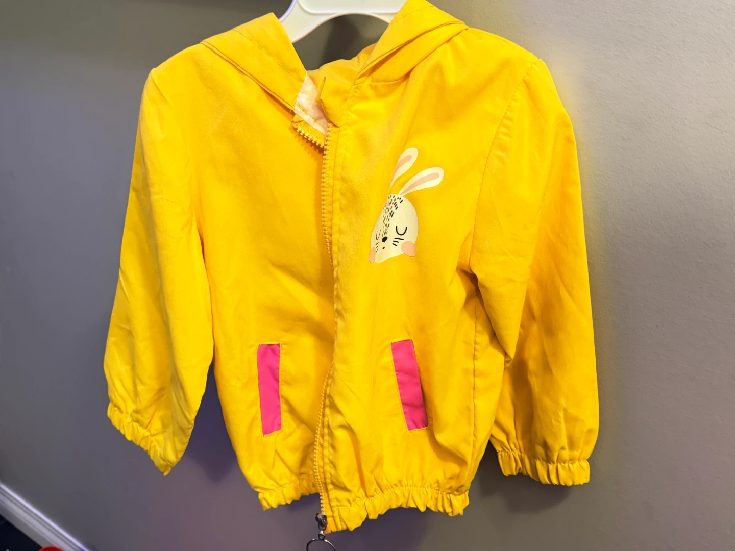 A cute yellow rain jacket for kids! It features a sweet bunny design and pink pocket details. Perfect for keeping your little one dry and stylish on rainy days