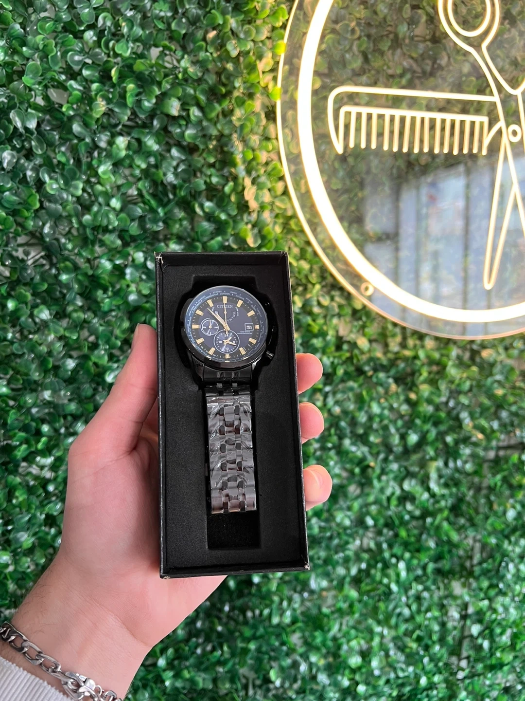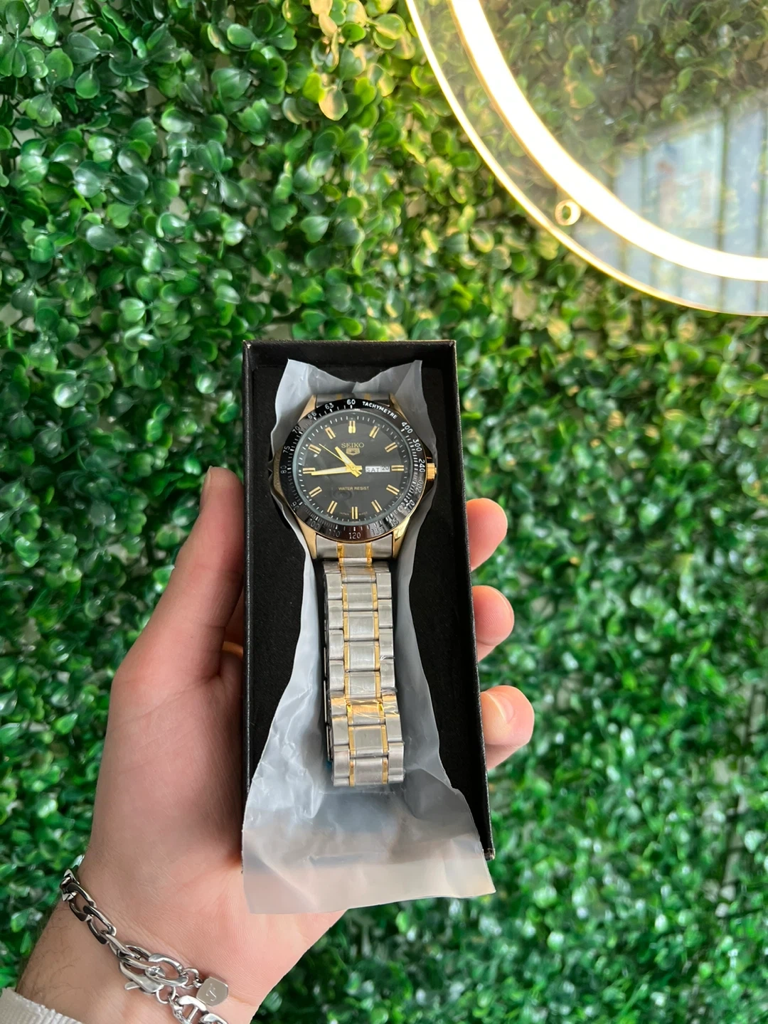 This Seiko chronograph watch features a stainless steel band and a black dial with gold accents. It's presented in its original box. Water resistance up to 100 meters.