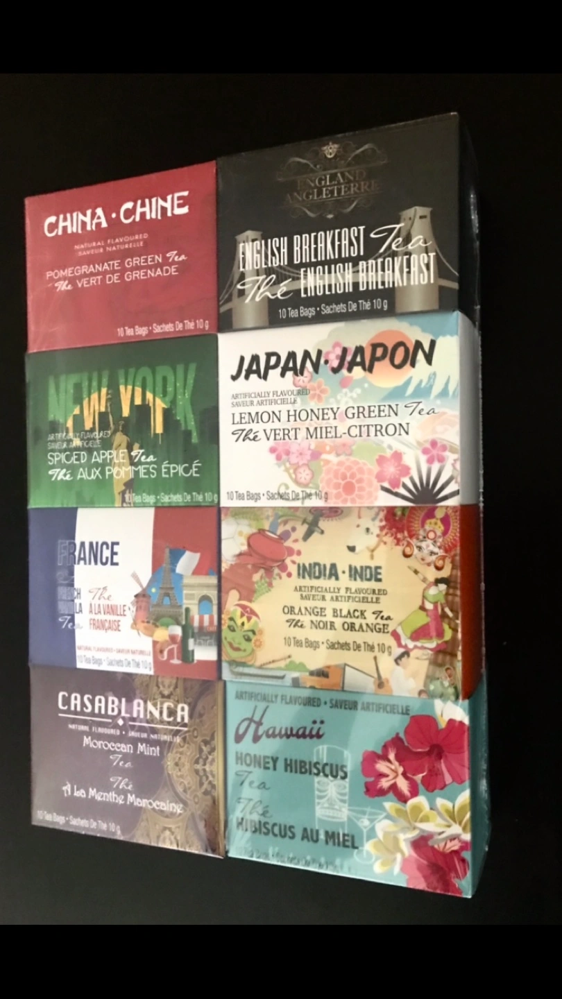 An assortment of 8 different Teas representing 8 different cities/flavors.