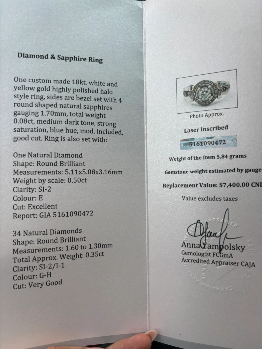 One custom made 18kt white and yellow gold ring with a halo of round natural sapphires and a central round brilliant diamond. The ring also features 34 natural diamonds on the band. This appraisal report is included.