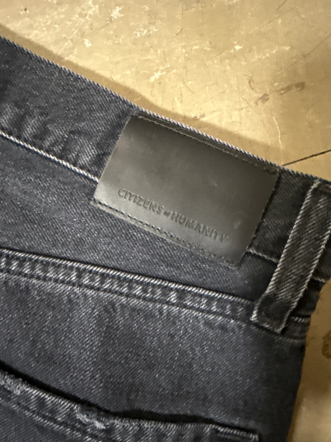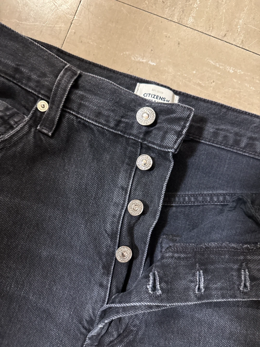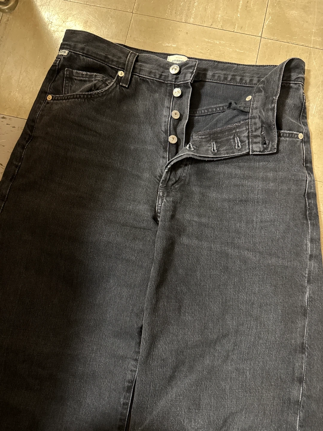 Citizens of Humanity black denim jeans with a button fly closure. These pants are made from a durable denim material. They're a versatile choice for everyday wear.