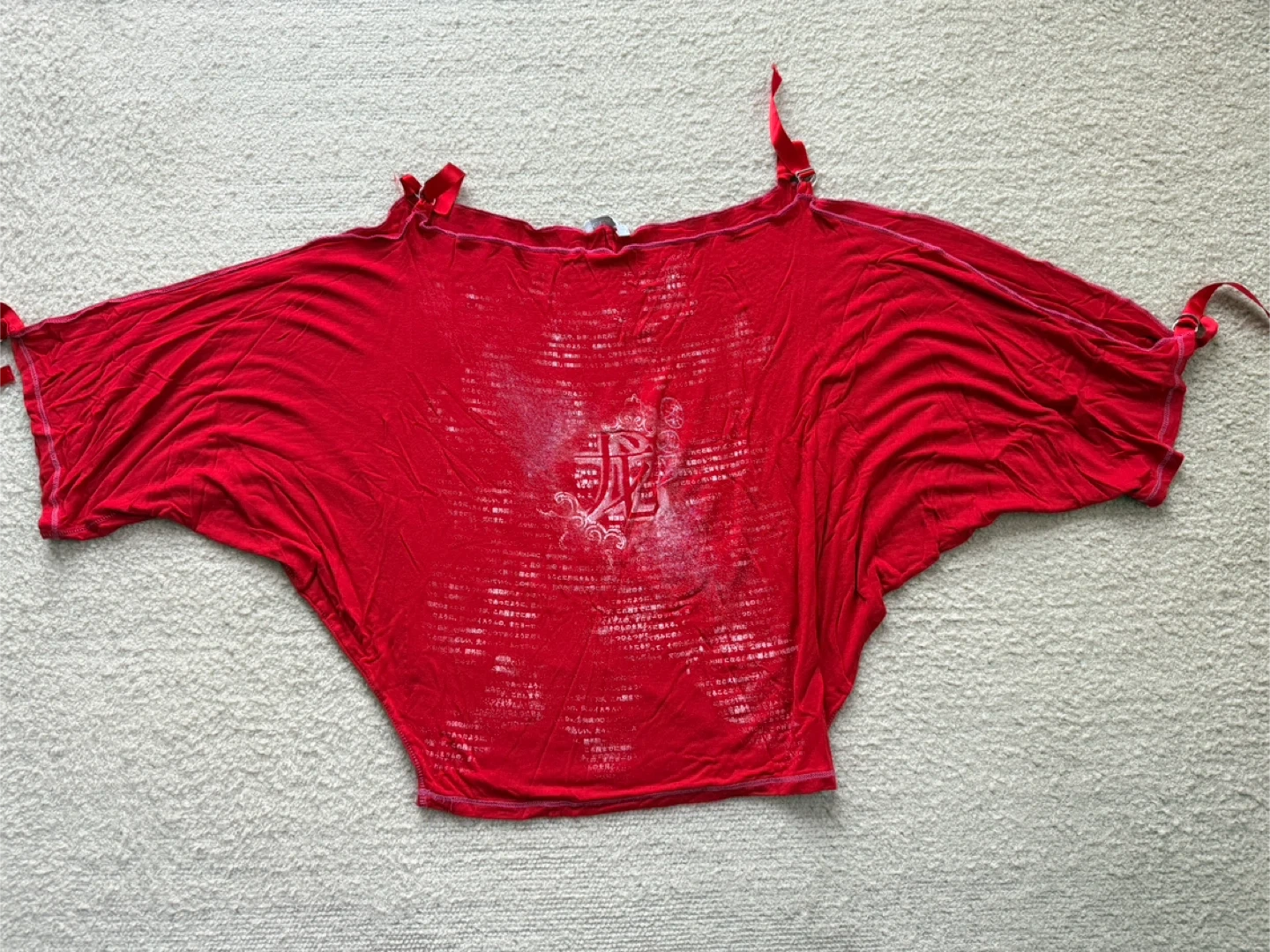 Red batwing sleeve top with a unique script print and distressed detailing. It has tie accents at the shoulders and sleeves. This top offers a stylish and comfortable fit.