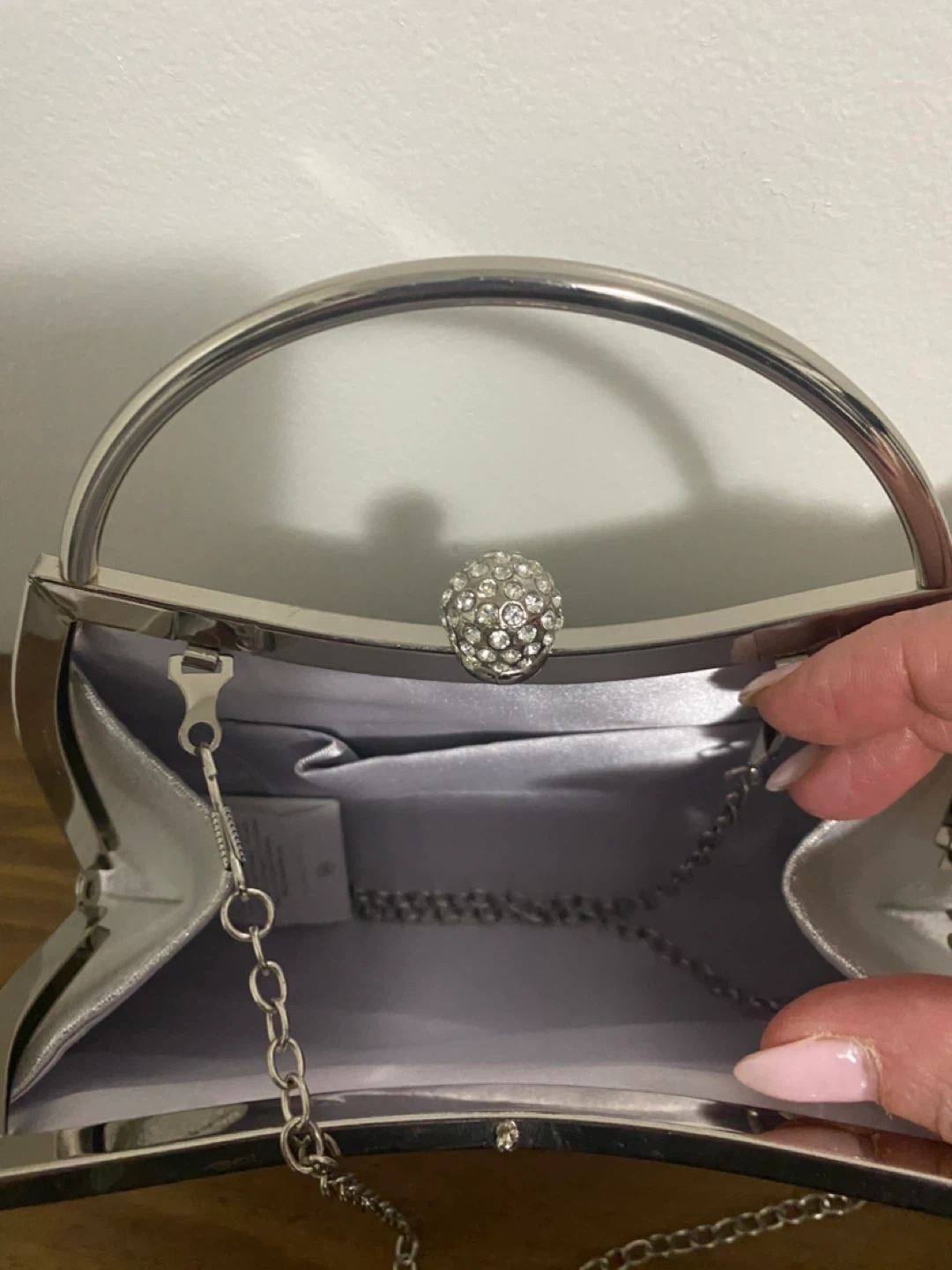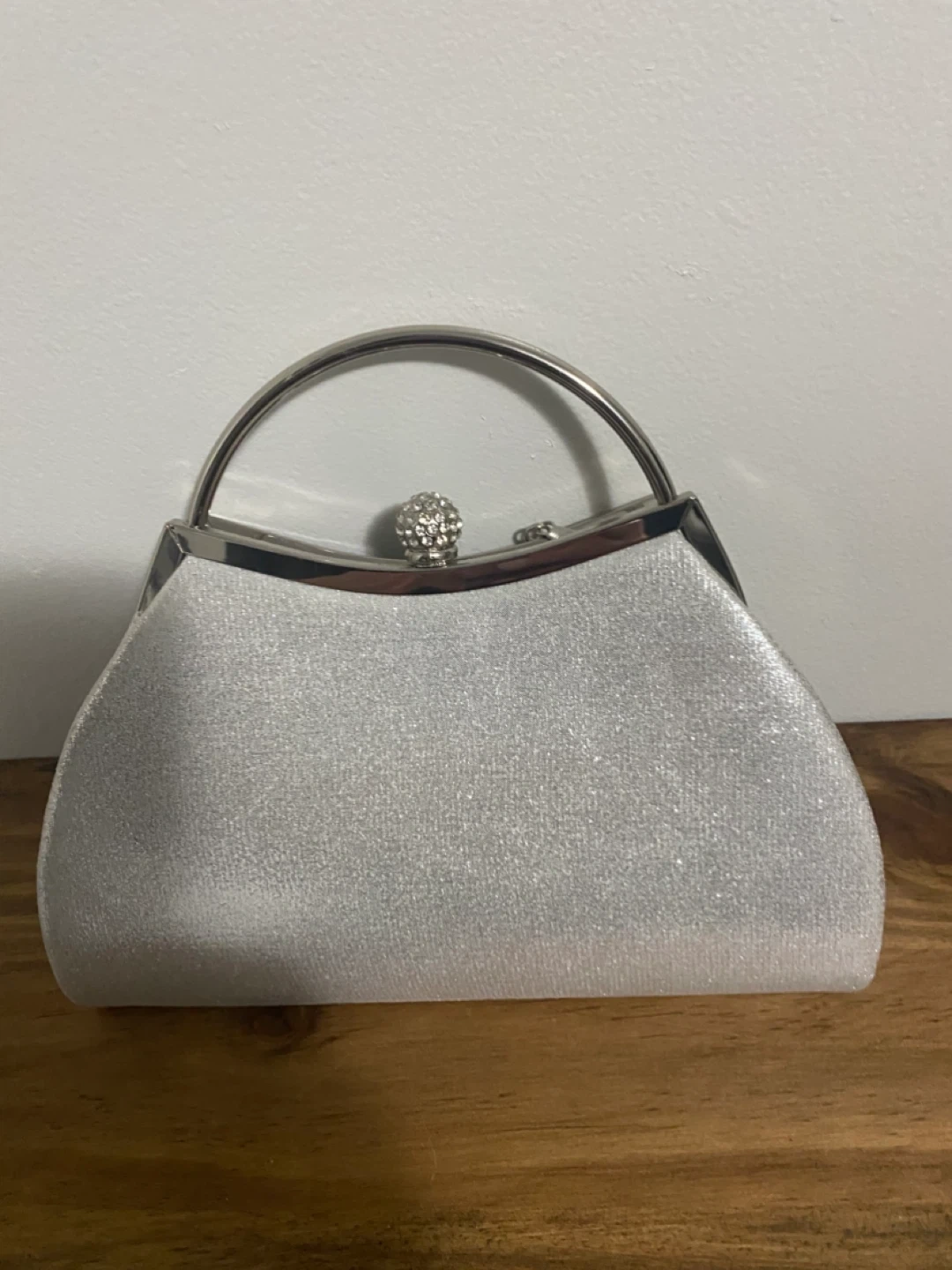 Sparkly silver clutch bag, perfect for evening events. It's approximately 8 inches wide. Includes a detachable silver chain strap. The fabric has a glittery finish, perfect condition , pet free home . Pick up in Newmarket