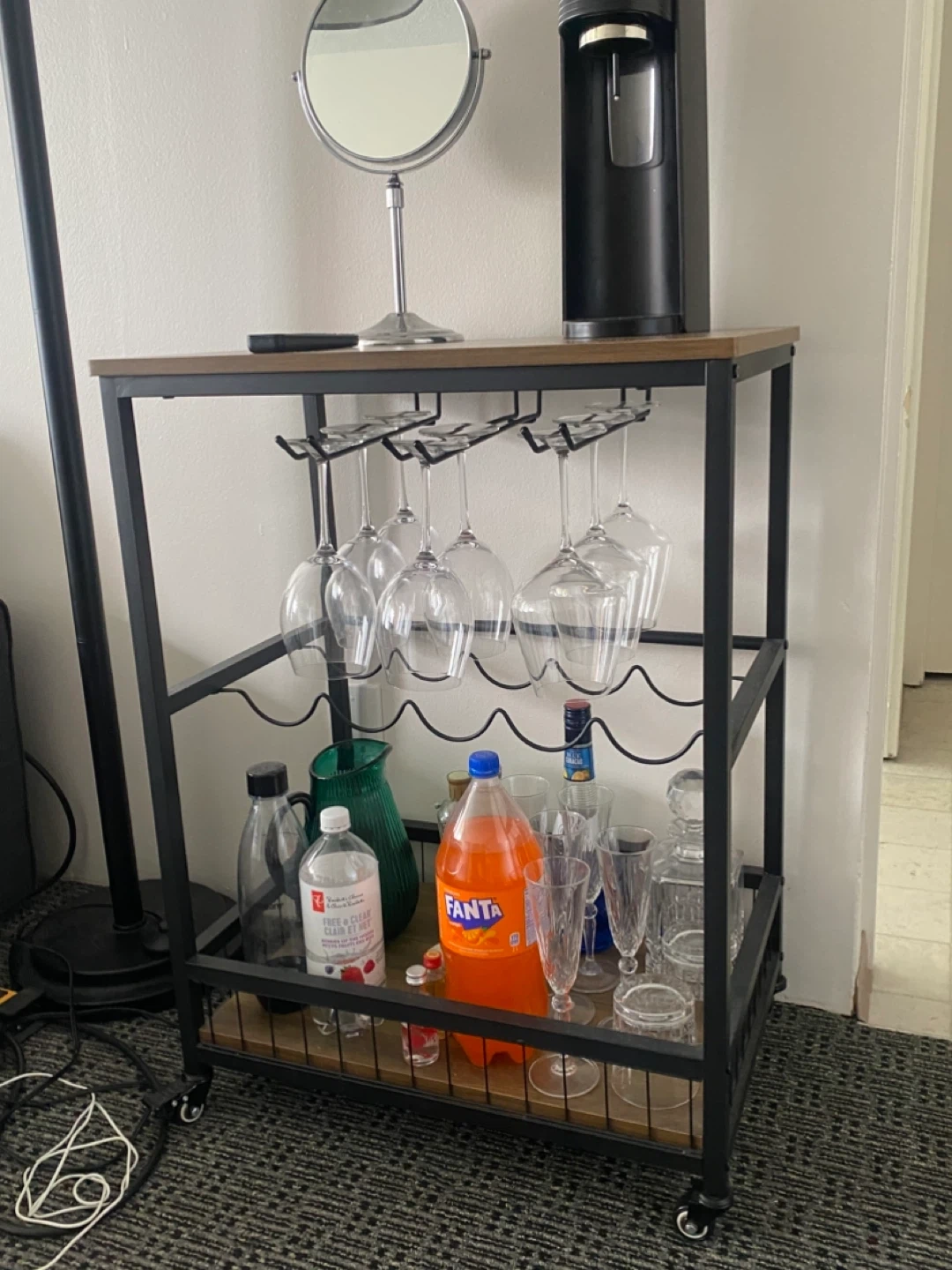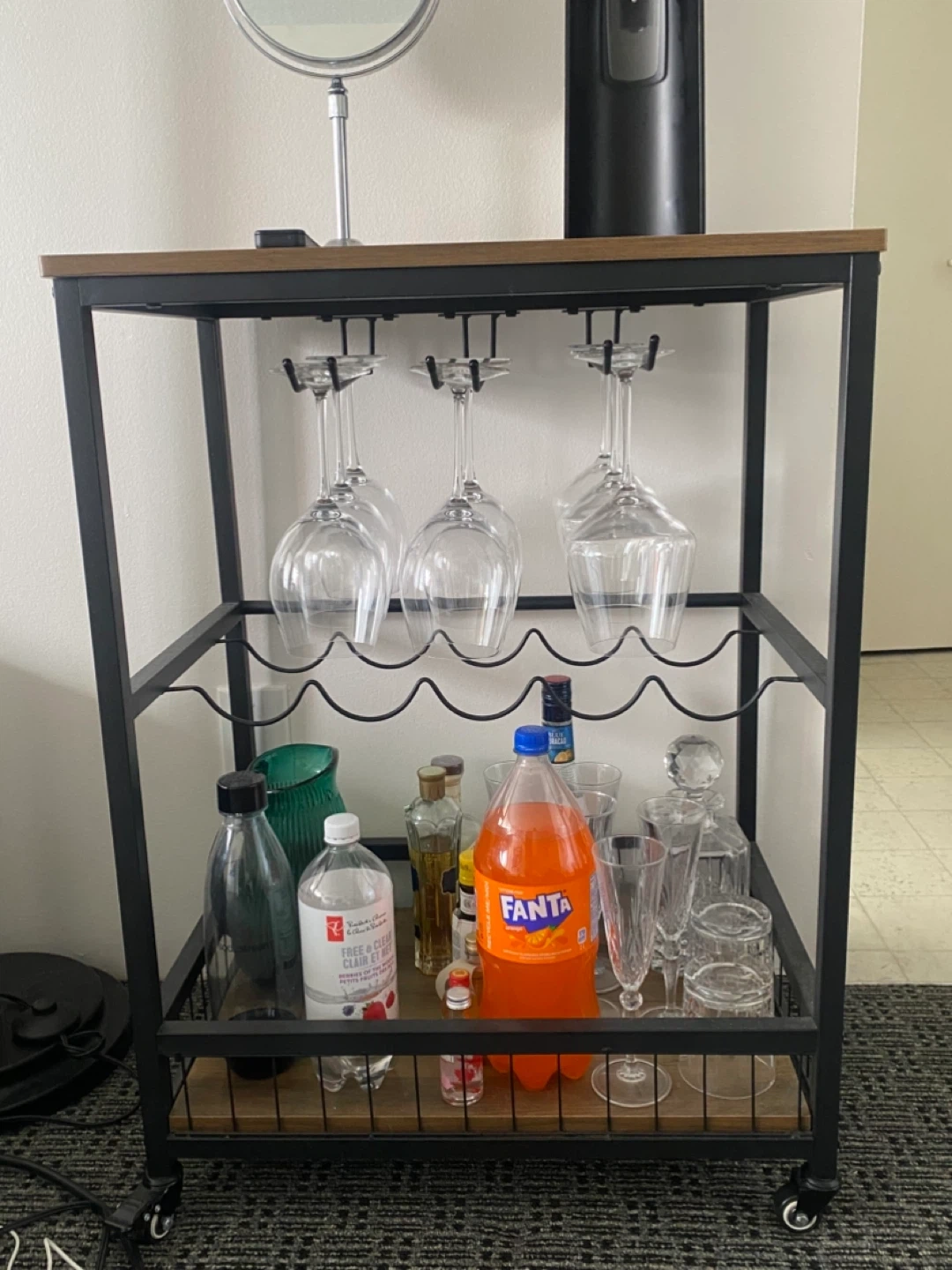 Industrial Style Bar Cart with Wine Glass Rack