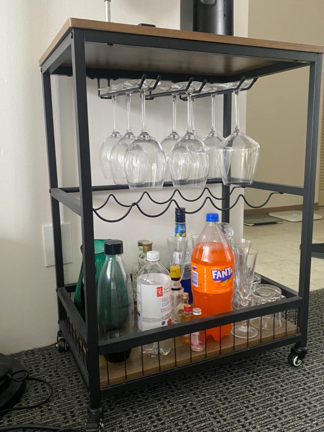 This bar cart features a metal frame and wood-look shelves, complete with a rack for wine glasses and a section for wine bottles. It's on wheels for easy movement. This cart is great for organizing drinks and glassware. Pick up only.