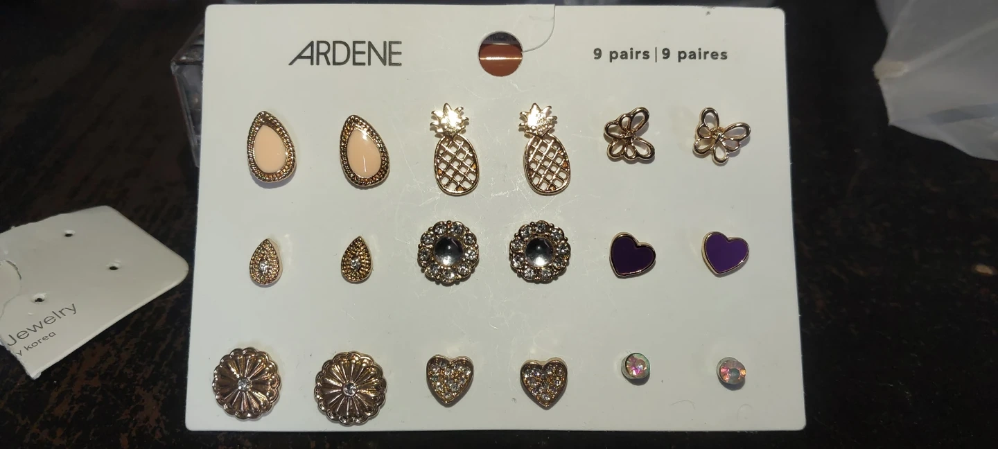 This Ardene earring set includes 9 pairs with various fun designs, including pineapples, hearts, and butterflies. They're made with a gold-tone finish. This set offers a good mix of styles for everyday wear.