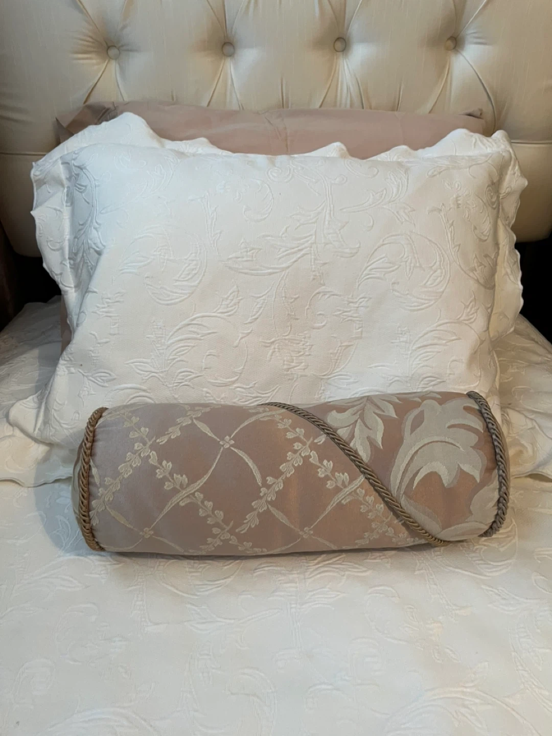 A lovely bolster pillow with a decorative damask-style pattern. It's finished with a braided cord trim on the ends. This pillow adds a nice accent to any bed or sofa!