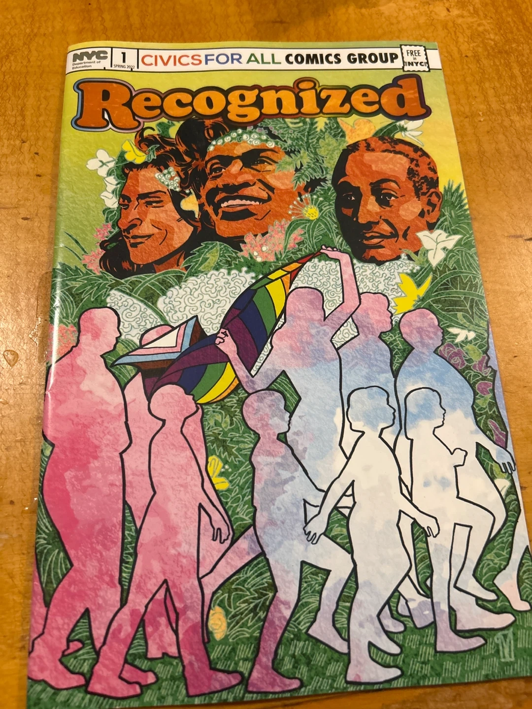 Civics For All Comics Group presents "Recognized" Issue 1. This comic features a vibrant cover with silhouettes of people marching and portraits of individuals. Published Spring 2022.
