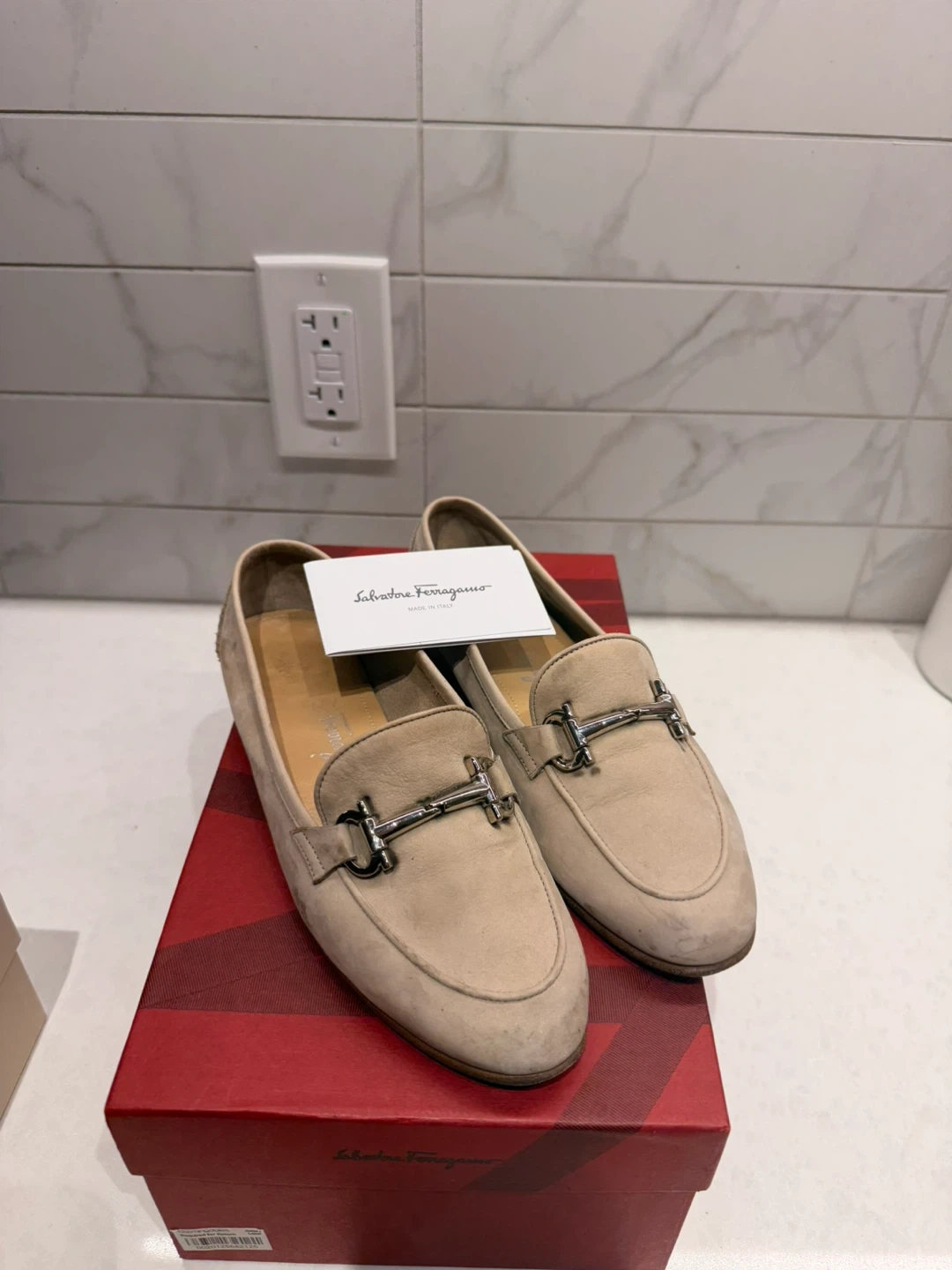 These are Salvatore Ferragamo suede loafers in a light beige colour. They feature the classic Gancini hardware. Comes with original box.
