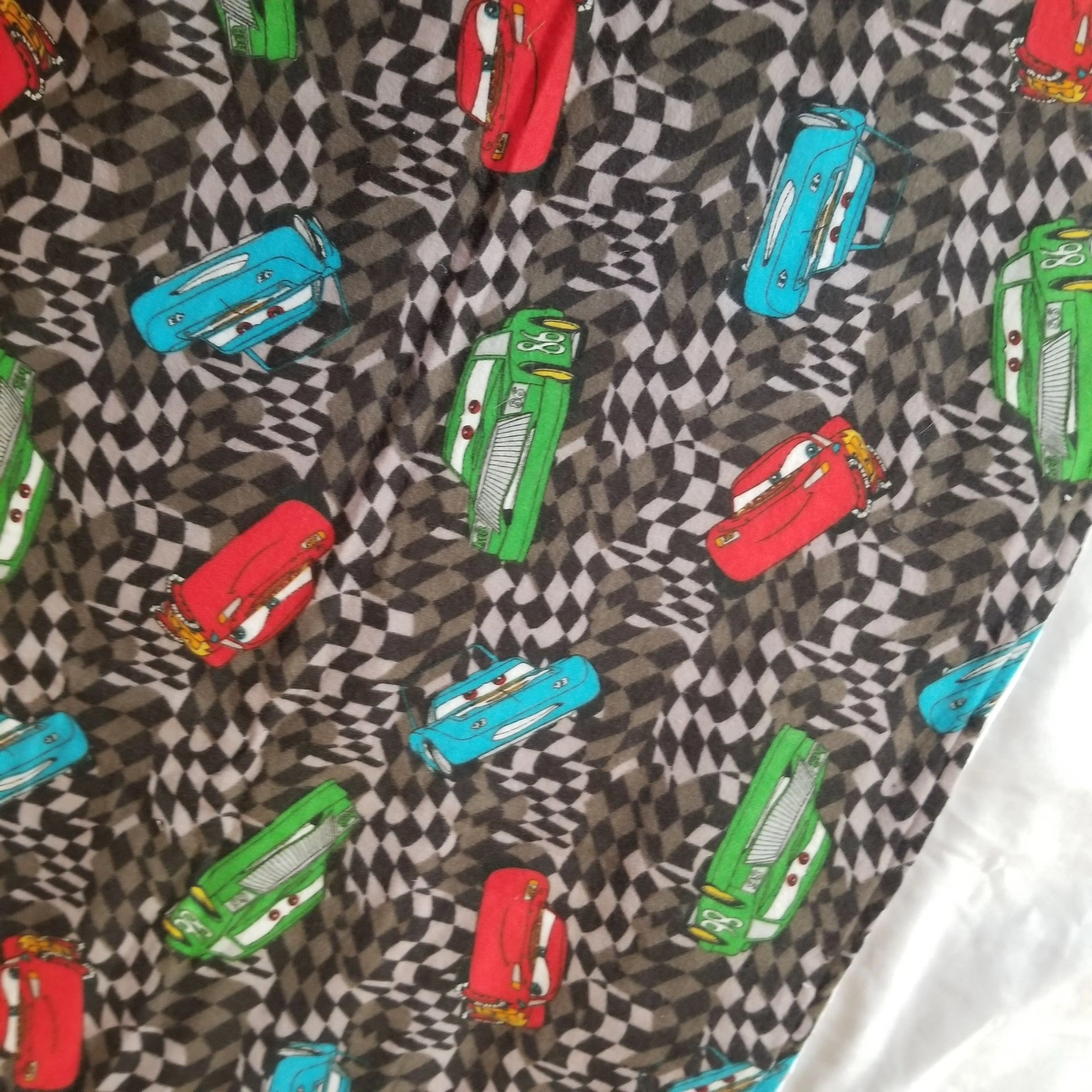 Adorable flannel cars on one side, cream corduroy on the other. Large size, approximately 18 by 30 inches, with a tie closure. All fabric, no plastic. Handmade and washable. Pick up in Niles, Illinois.