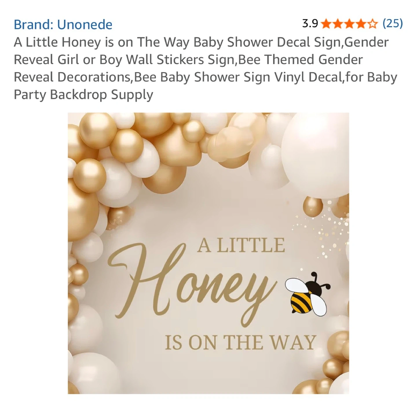 This is a "A Little Honey is On The Way" baby shower decal sign. It's great for gender reveal parties or as a bee-themed baby shower backdrop. It's a vinyl decal for party decor.