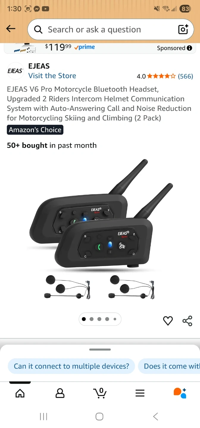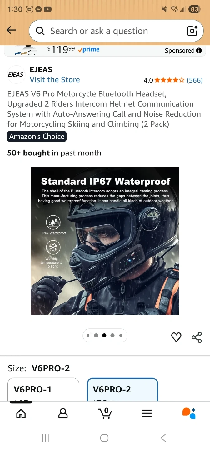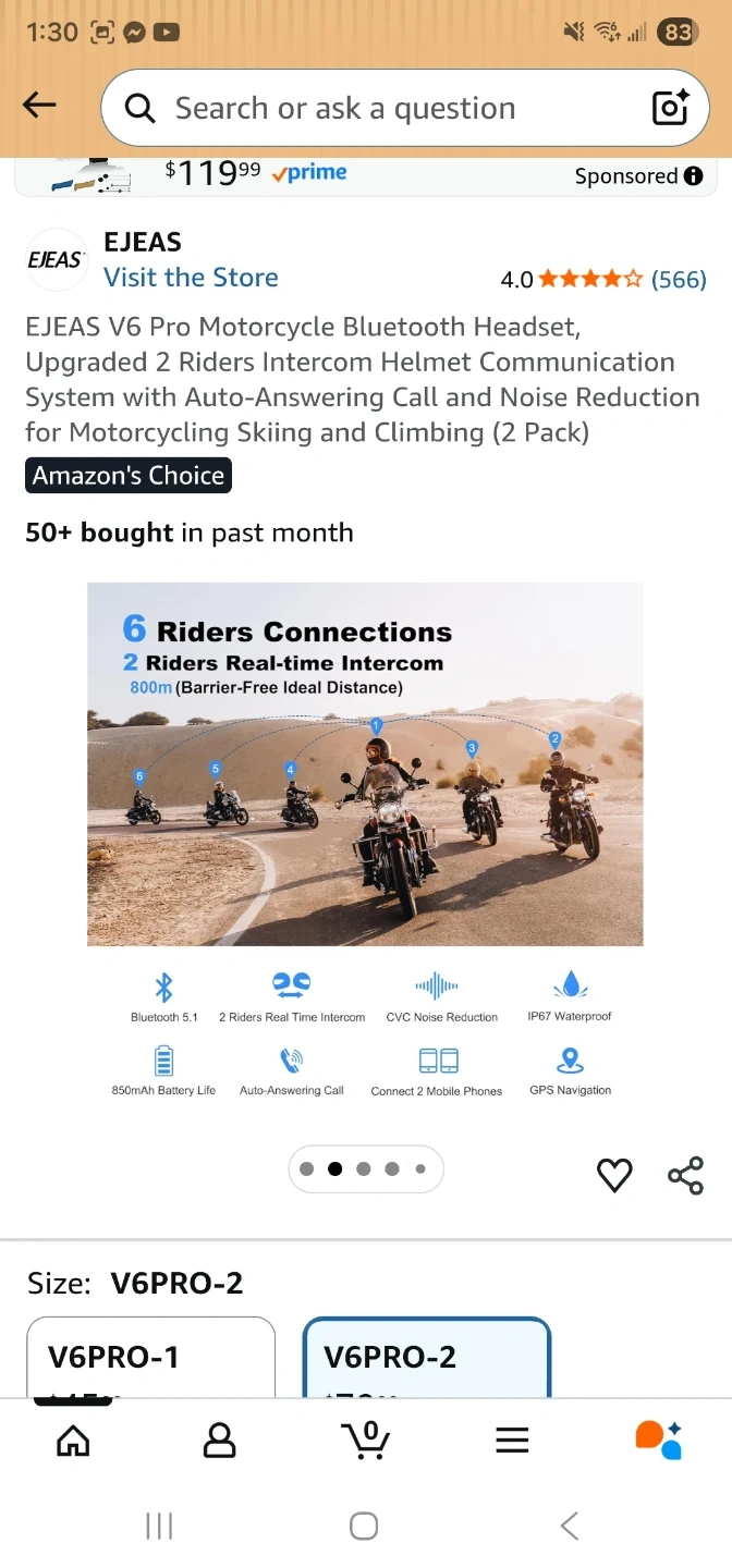 EJEAS V6 Pro Motorcycle Bluetooth Headset, upgraded for 2 riders. It offers real-time intercom and noise reduction. It's IP67 waterproof with an 850mAh battery. This headset supports auto-answering calls and GPS navigation.