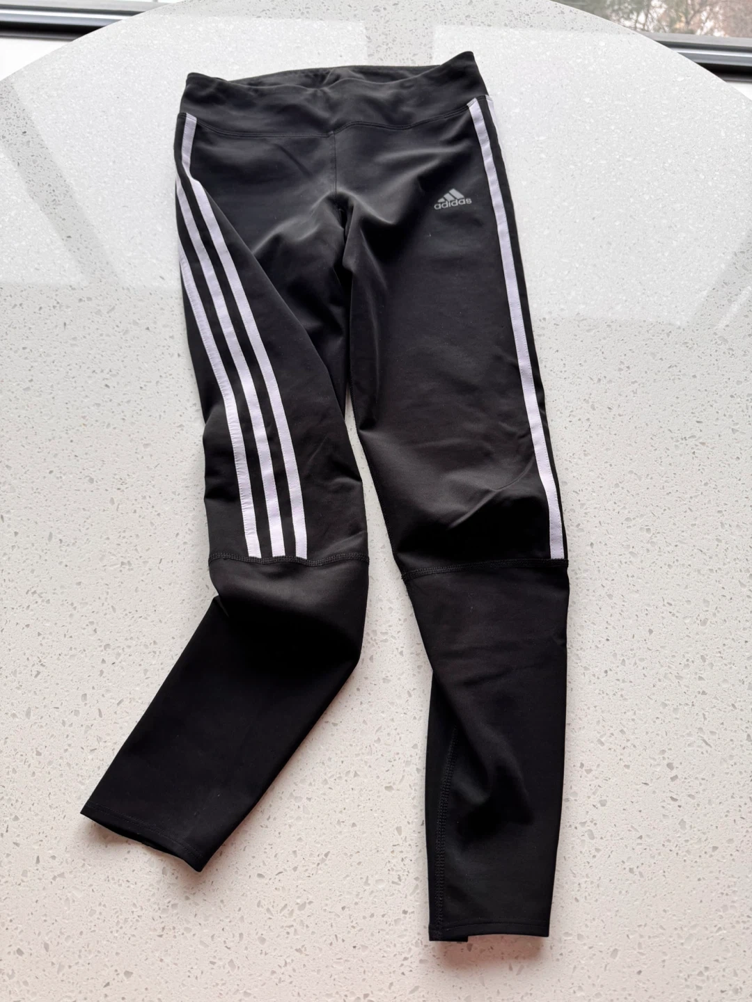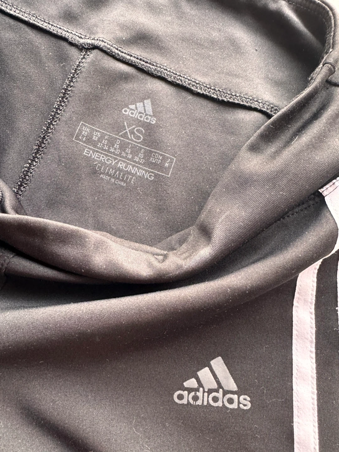 Adidas black running tights with signature three stripes. Made with Climalite fabric for moisture-wicking. Size XS.