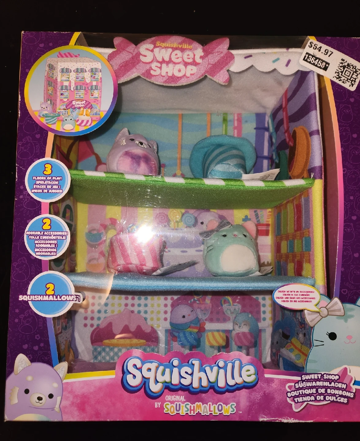 Squishville Sweet Shop playset includes 3 floors of play, 2 removable accessories, and 2 Squishmallows.