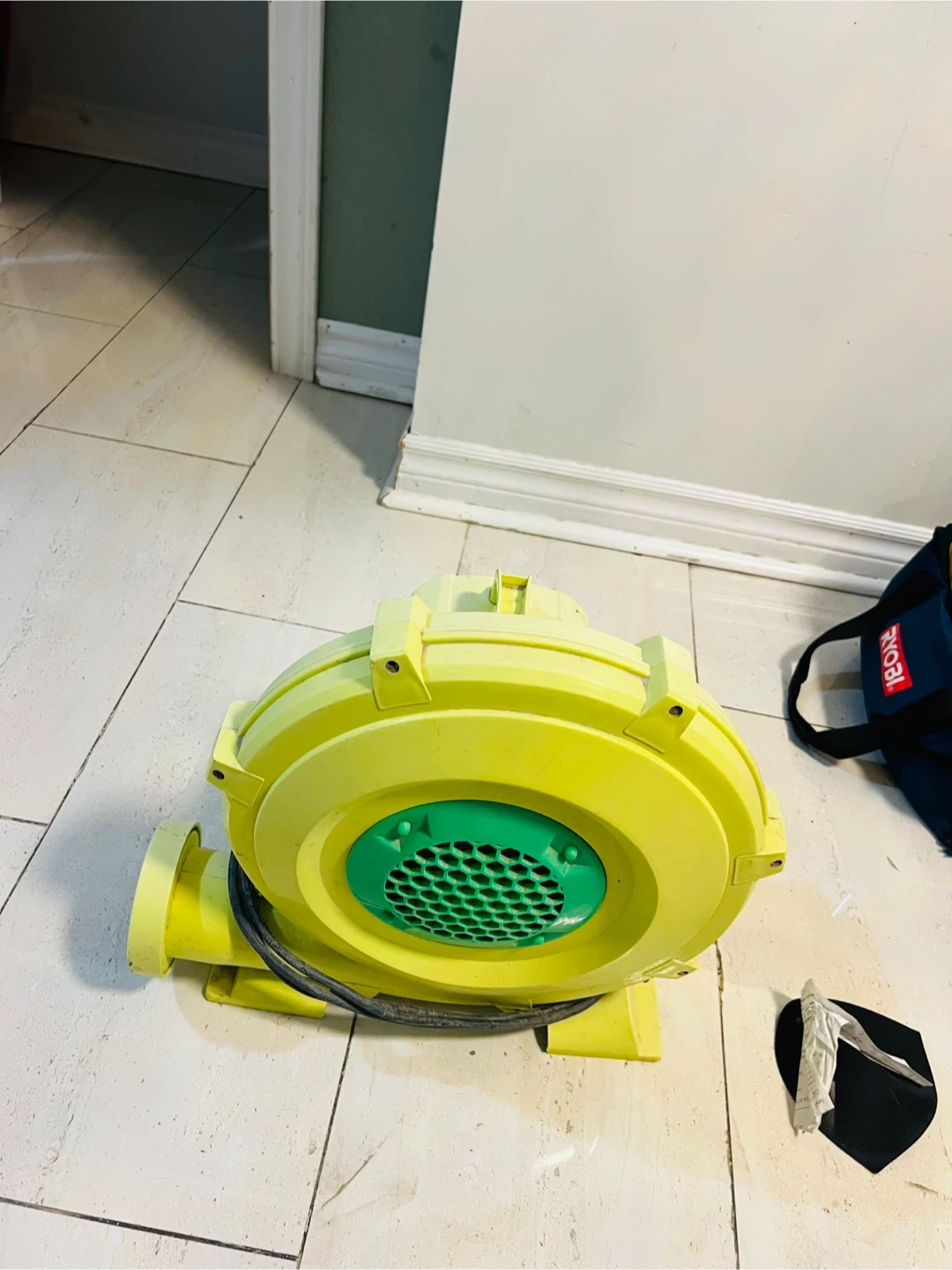 This is a yellow blower fan, commonly used for inflatable structures. It features a durable plastic casing and a powerful motor. The fan includes its power cord for immediate use. It's great for parties or events where inflatable attractions are used!