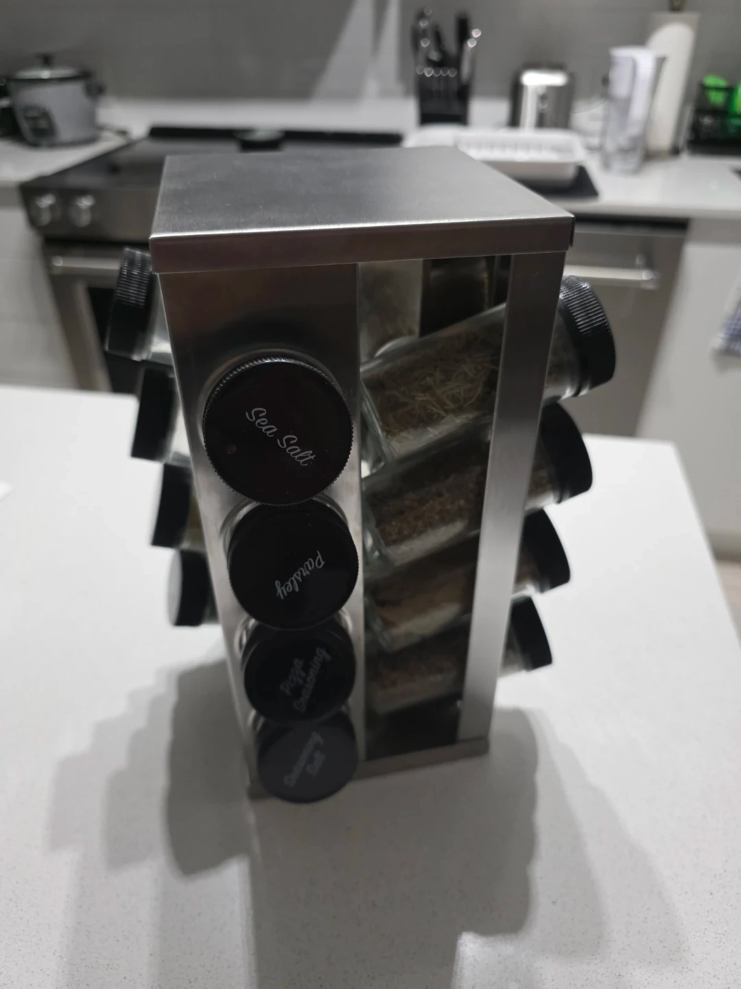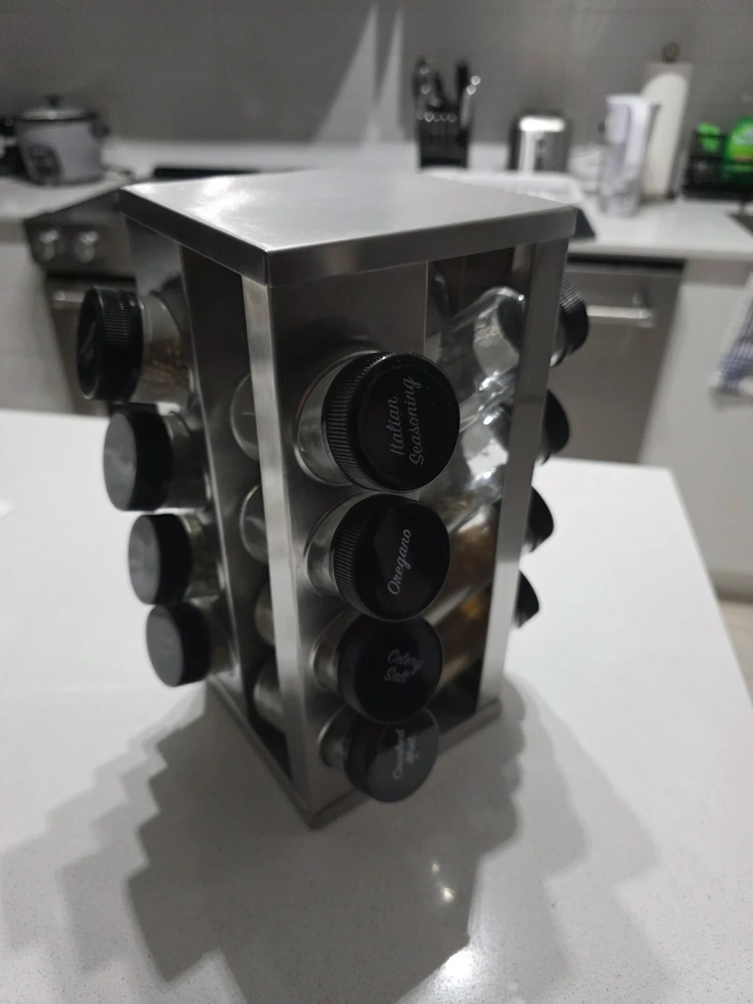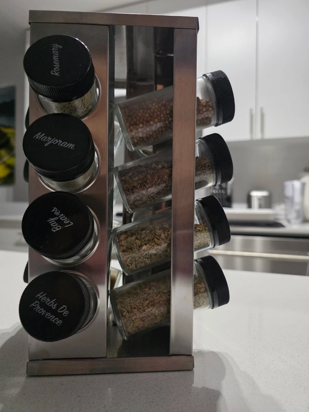 This is a 16-jar rotating spice rack, perfect for organizing your kitchen. It includes various spices like Rosemary, Oregano, and Sea Salt. The rack is made of stainless steel. The jars are labelled.