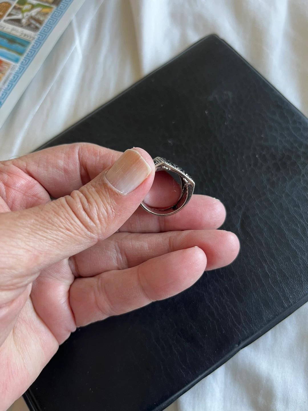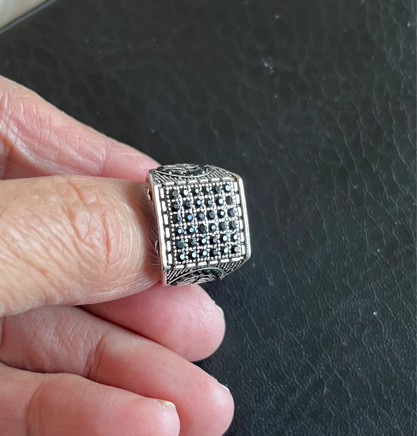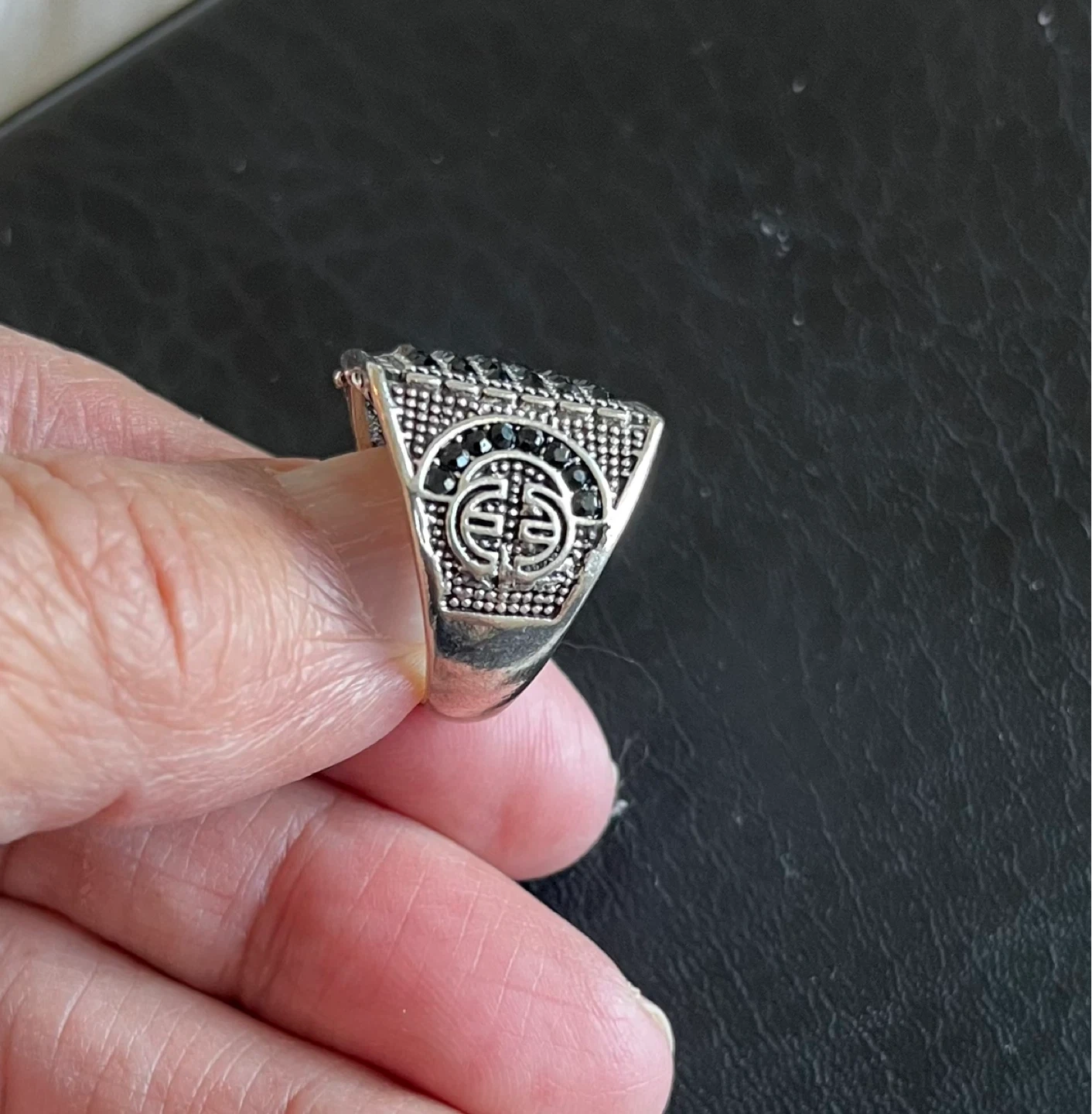 Black zarkoon not silver This men's ring features a silver-tone metal band embellished with black stones and intricate detailing. The statement design makes it a bold accessory choice. It's suitable for adding a touch of flair to any outfit.