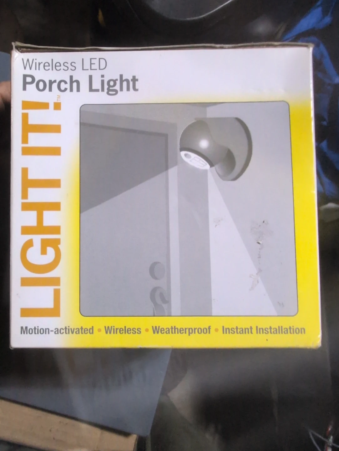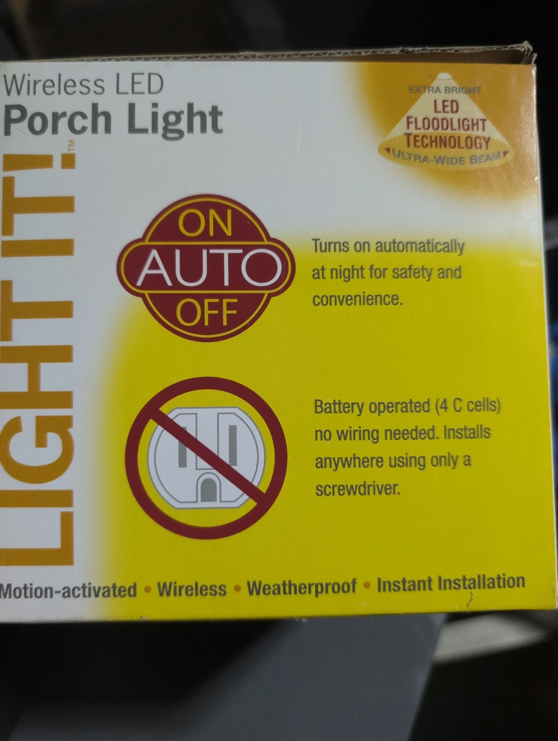 This is a white, wireless LED porch light by LIGHT IT!. It's motion-activated, weatherproof, and installs instantly. Battery operated with no wiring needed. Turns on automatically at night for safety and convenience.