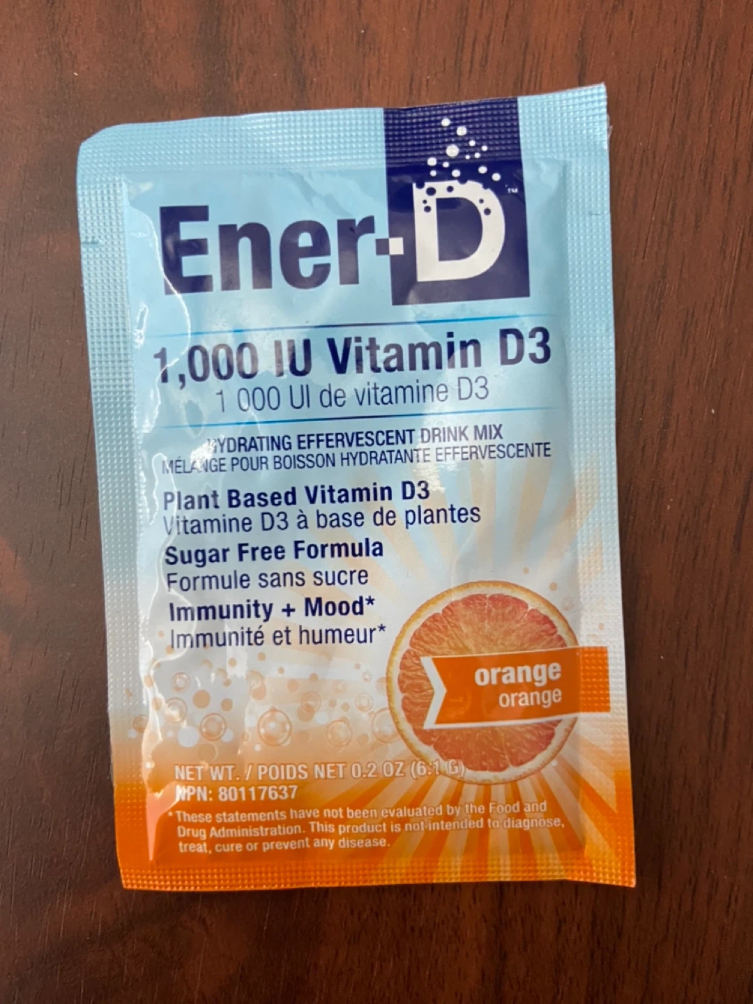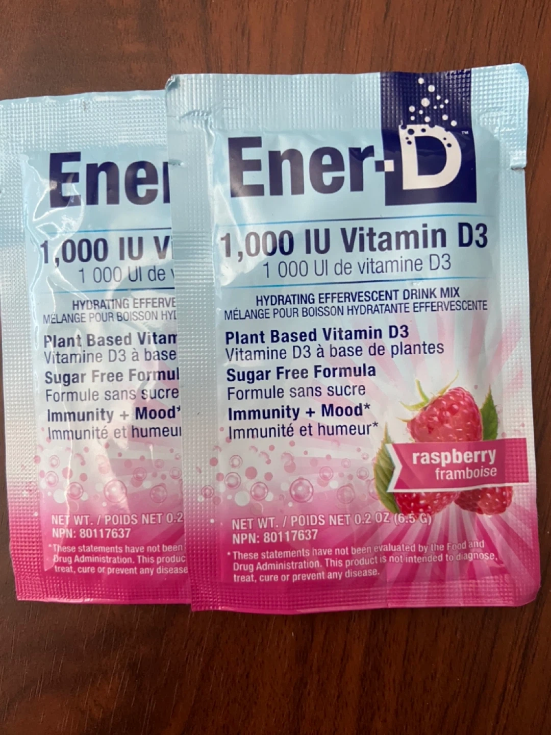 This listing includes three single-serving drink mix packets: Ener-C Passionfruit (Vitamin C), Ener-D Raspberry (Vitamin D3), and Ener-D Orange (Vitamin D3). All are sugar-free formulas designed for immunity and energy support. Each packet weighs 0.2 oz.