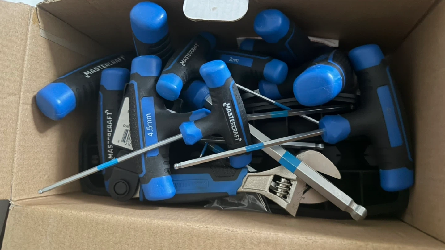 This is a 10-piece Mastercraft T-handle hex key set. Includes various sizes with blue and black handles. Comes with a holder insert. Great for mechanics and DIYers!