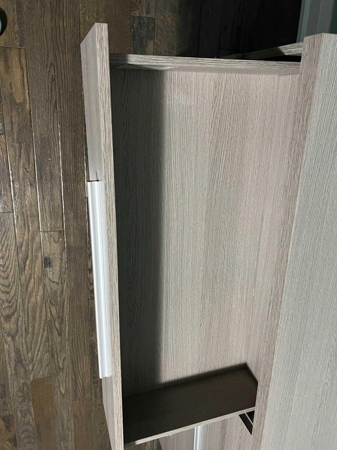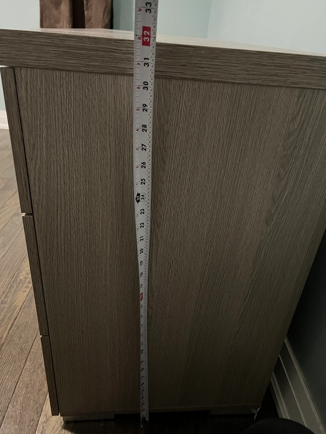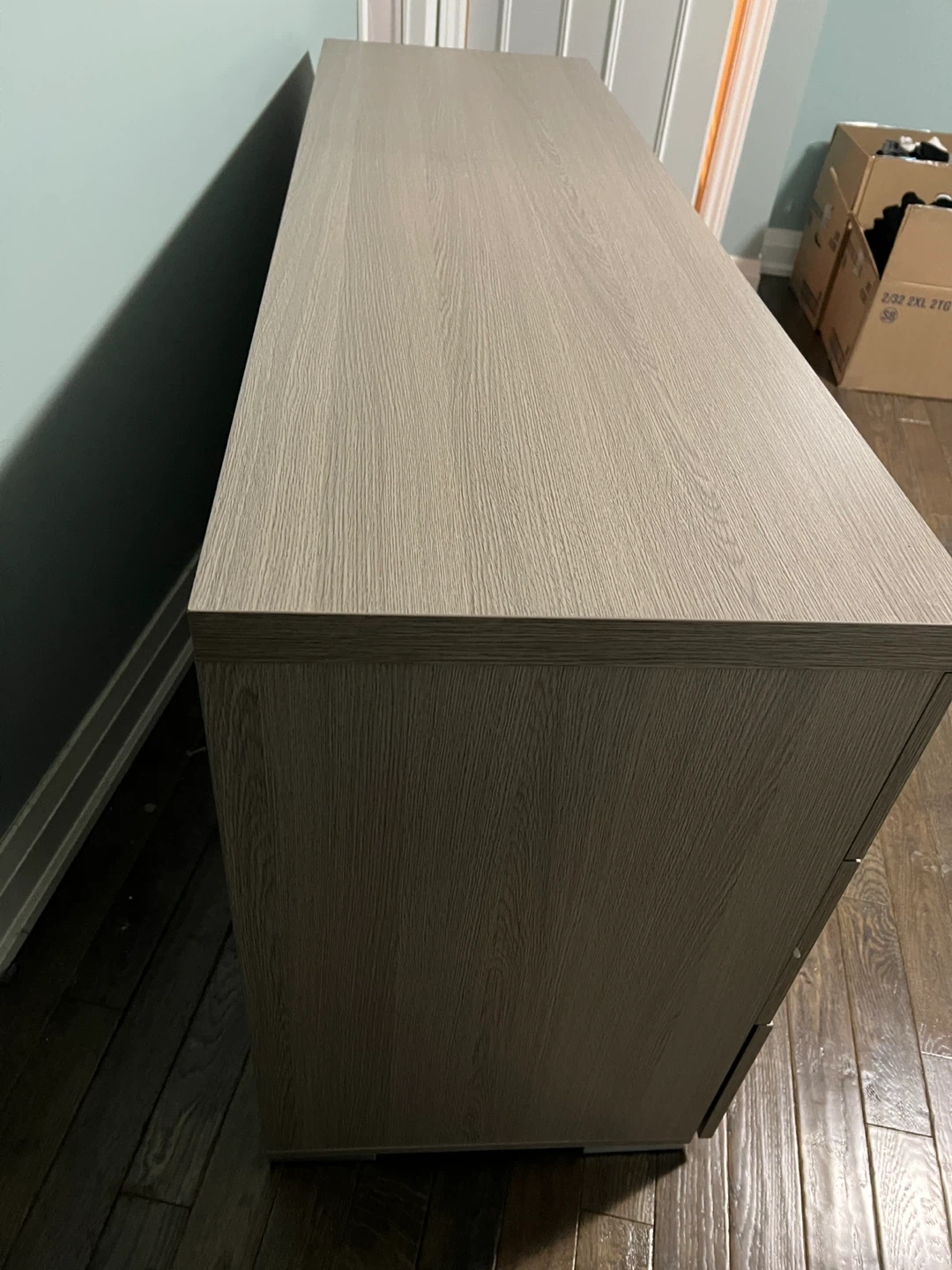 This dresser features a light oak finish and six spacious drawers with sleek silver handles. It's made from engineered wood. The dresser measures approximately 64 inches wide, 20 inches deep, and 30 inches high. It's a practical storage solution for any bedroom!