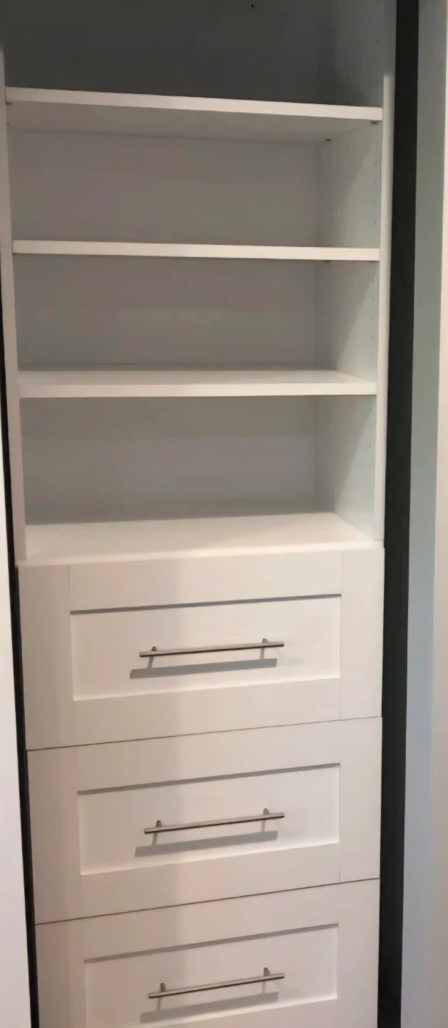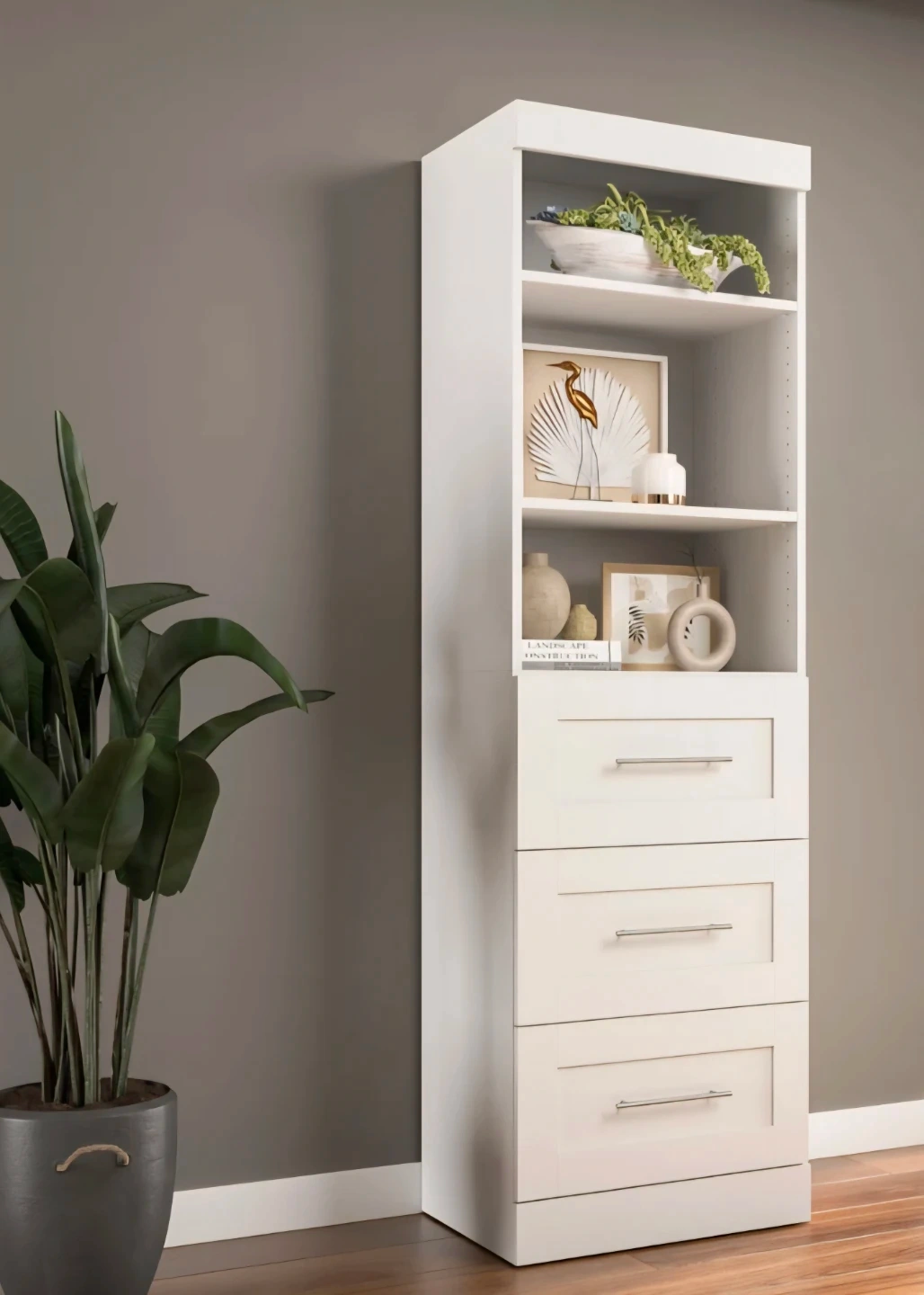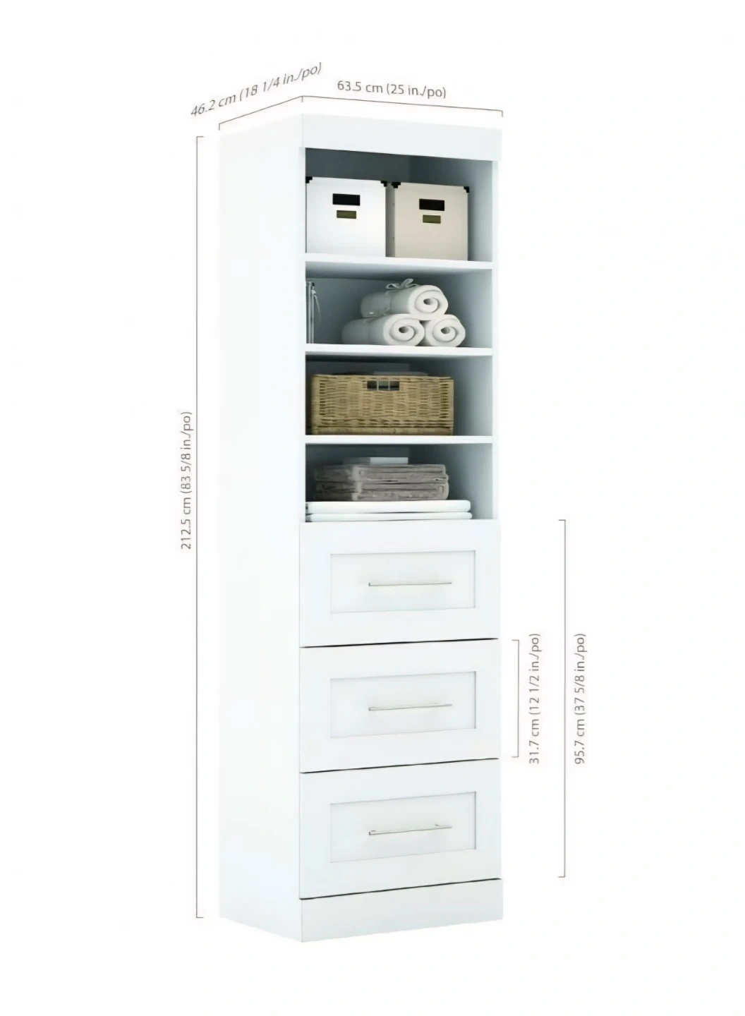Selling a white closet organizer with drawers. It features open shelves and three drawers for storage. The dimensions are approximately 18 1/4 inches wide, 25 inches deep, and 83 5/8 inches tall. Great for adding extra storage to any room