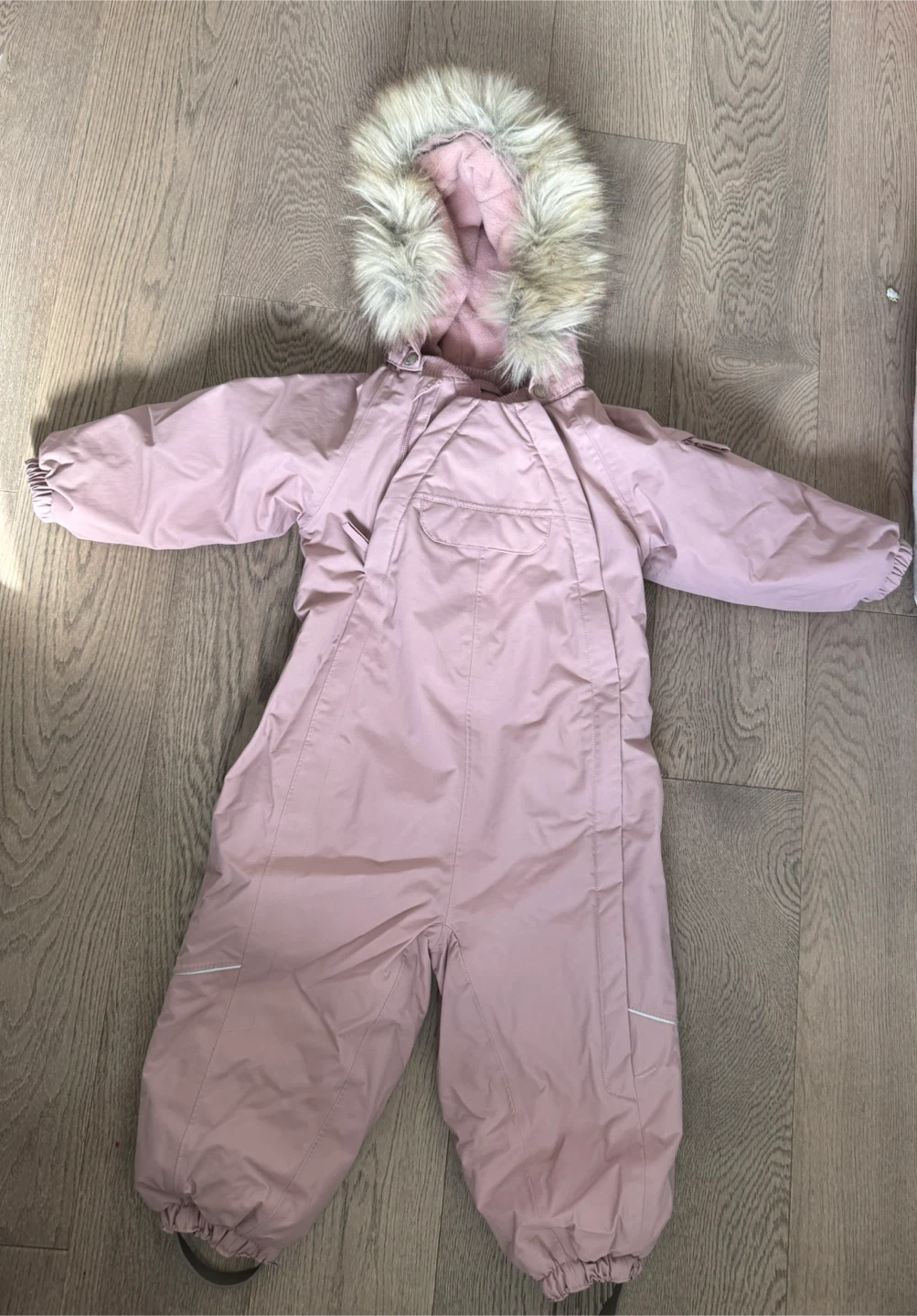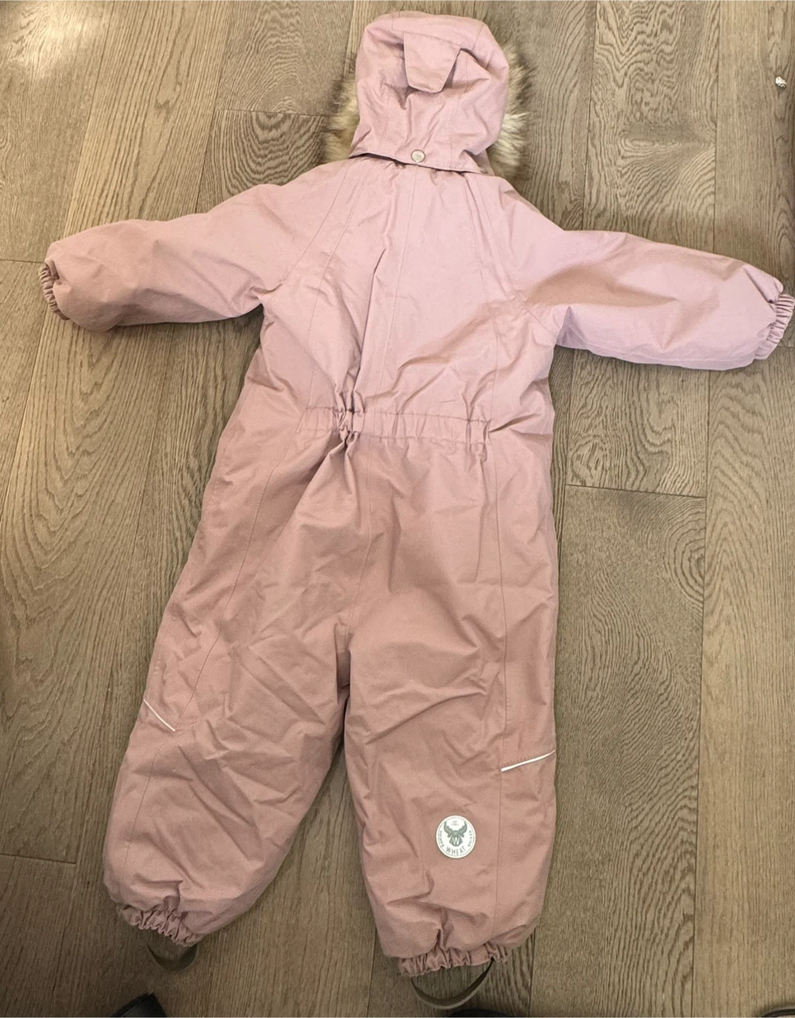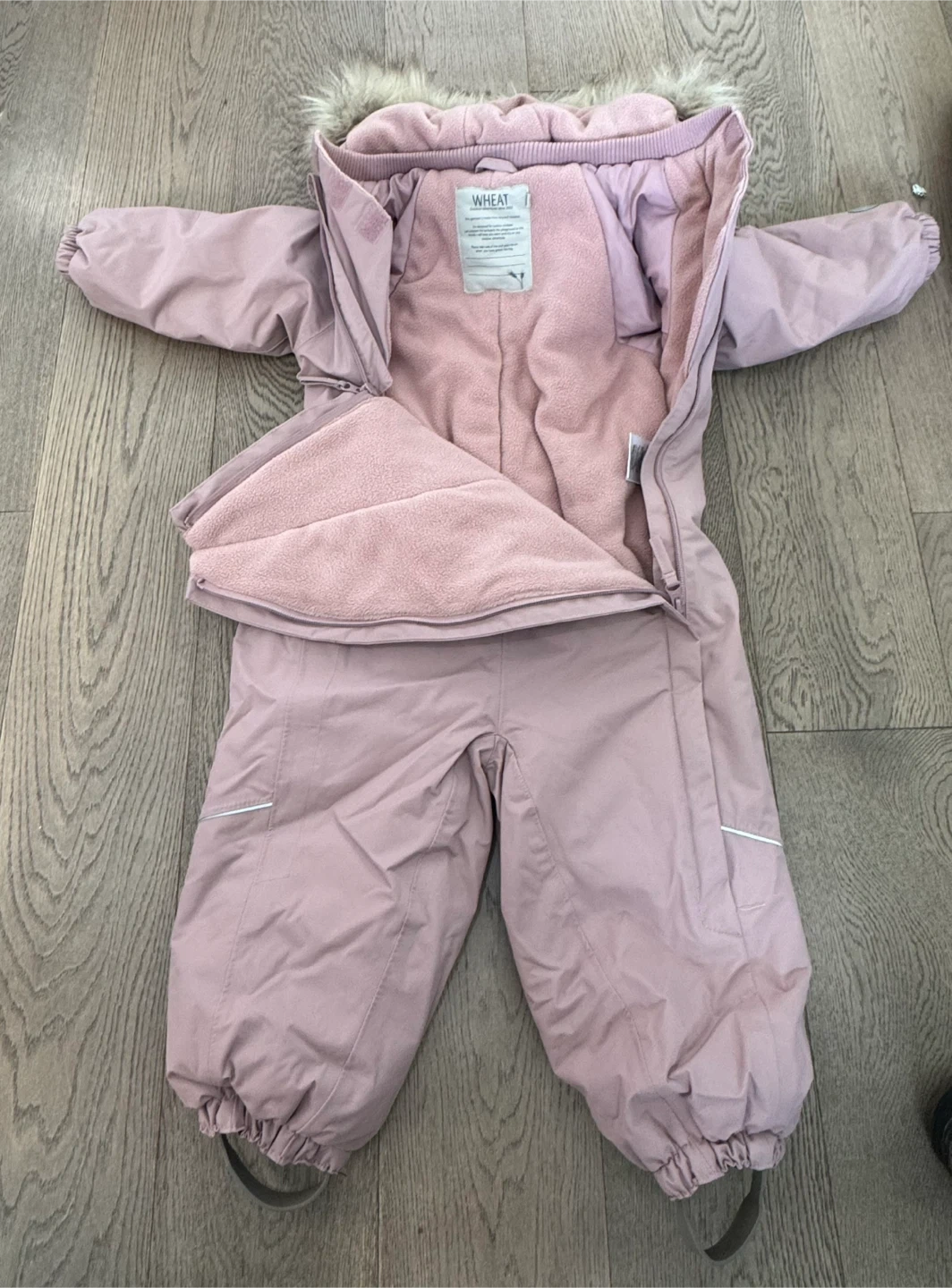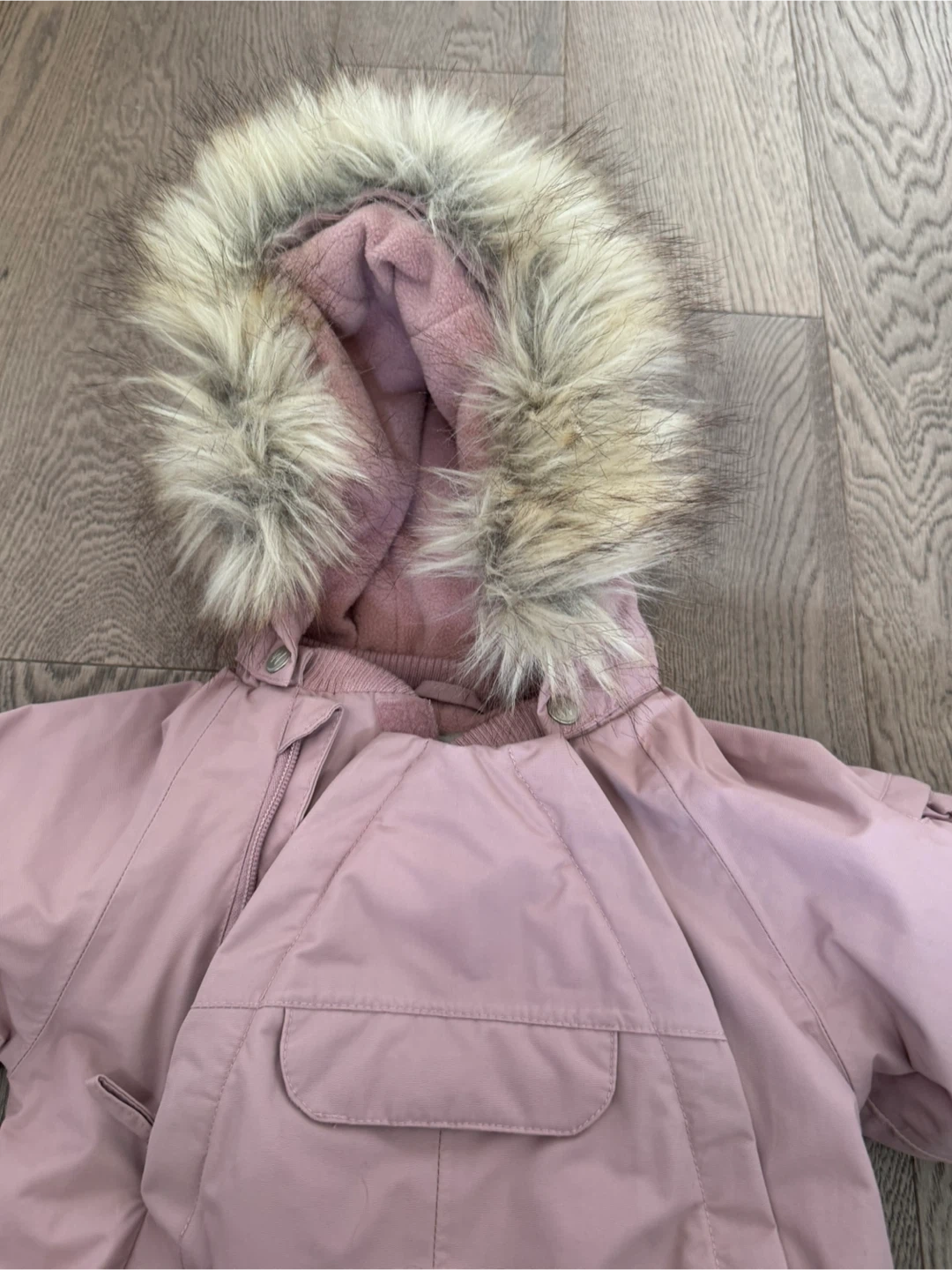 Like New and in excellent condition! Only worn by one child during one season. This pink snowsuit from Wheat is designed for winter warmth. It features a cozy fleece lining and a detachable faux fur hood trim. The elasticated waist and cuffs help keep out the cold.