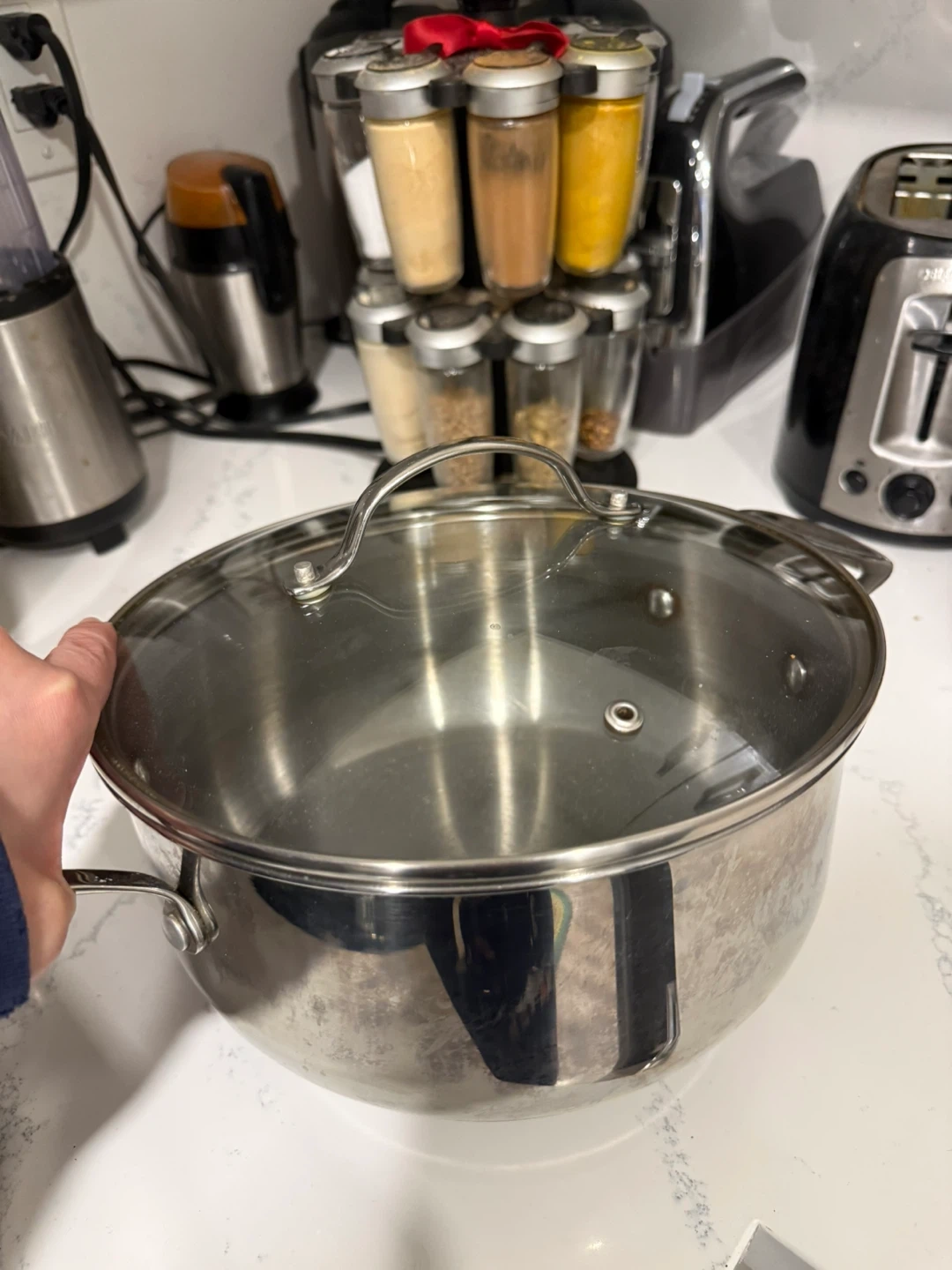 This is a stainless steel cooking pot with a clear glass lid. It has two side handles for easy gripping. It's a good size for stews or soups.
