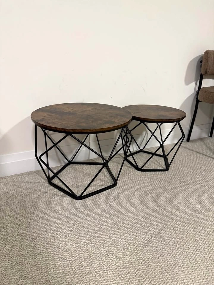 Brand new set of two wood side tables, one larger than the other. Both feature wooden tops with metal supporting bars. The wooden tops are easily removable. The larger table is 19.7" wide and 15.7" tall. The smaller table is 15.7" wide and 14.2" tall. Selling both as a pair, but open to selling them individually. Feel free to message if you have any questions!