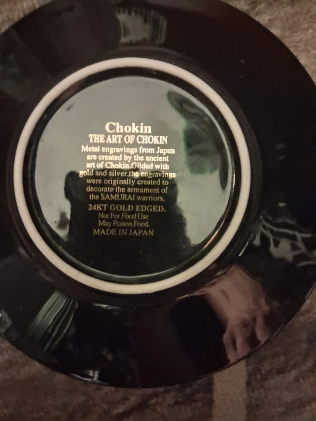 This decorative plate features metal engravings from Japan, created by ancient Chokin Guild artists. It's embellished with gold and silver, originally crafted to adorn the armour of samurai warriors. The plate is 24kt gold edged and made in Japan.