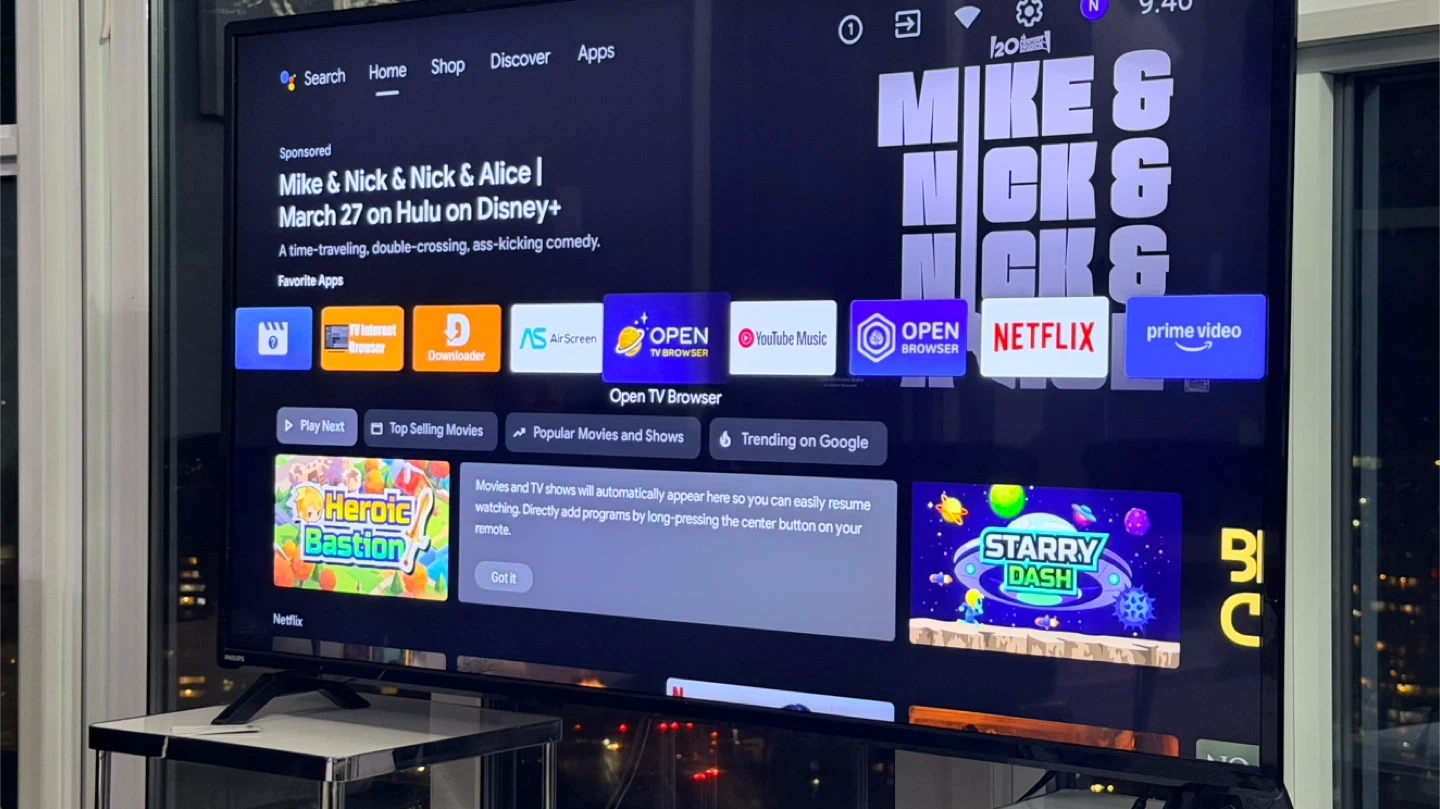 Philips Smart TV with Google TV interface. It includes popular apps like Netflix and Prime Video. Get easy access to movies and TV shows!