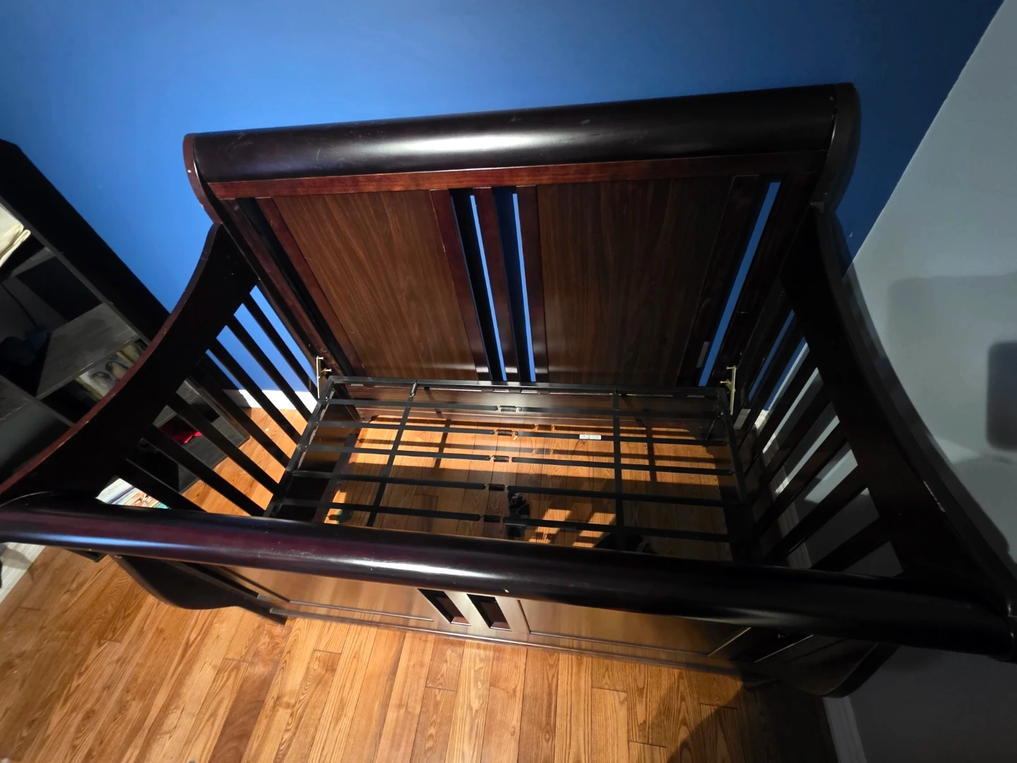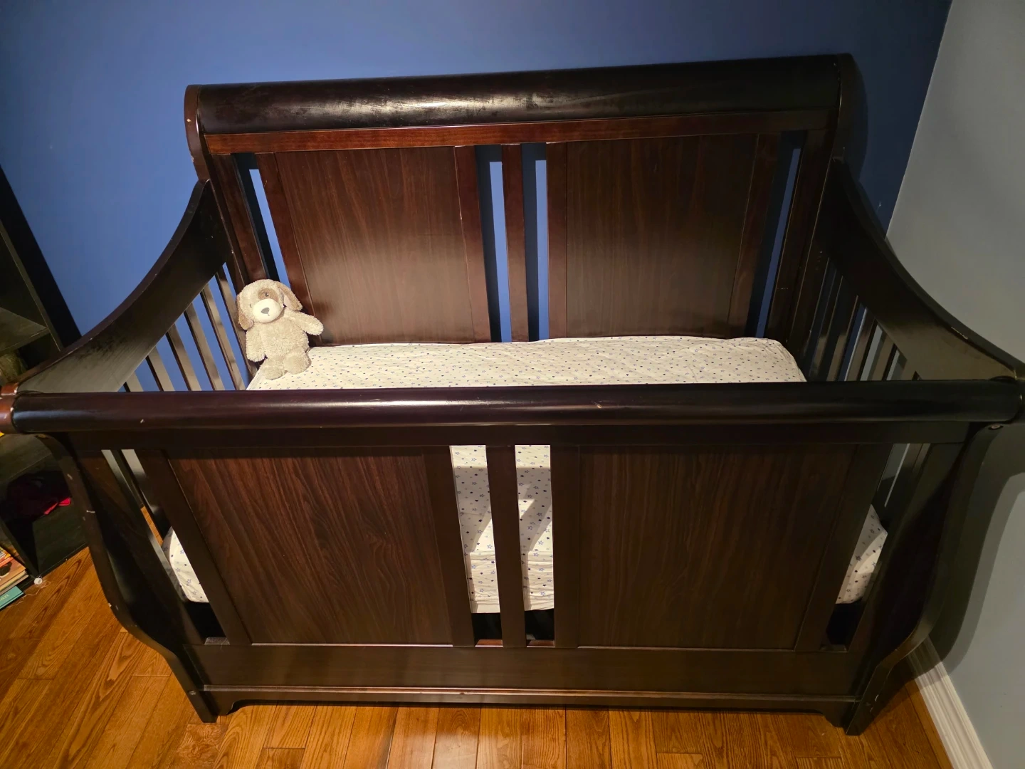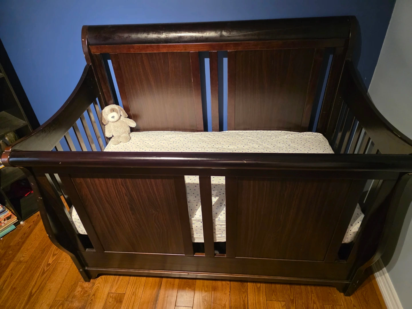 Selling a baby crib with a dark wood finish. It's in good condition and ready for a new little one! Comes with the mattress as well.