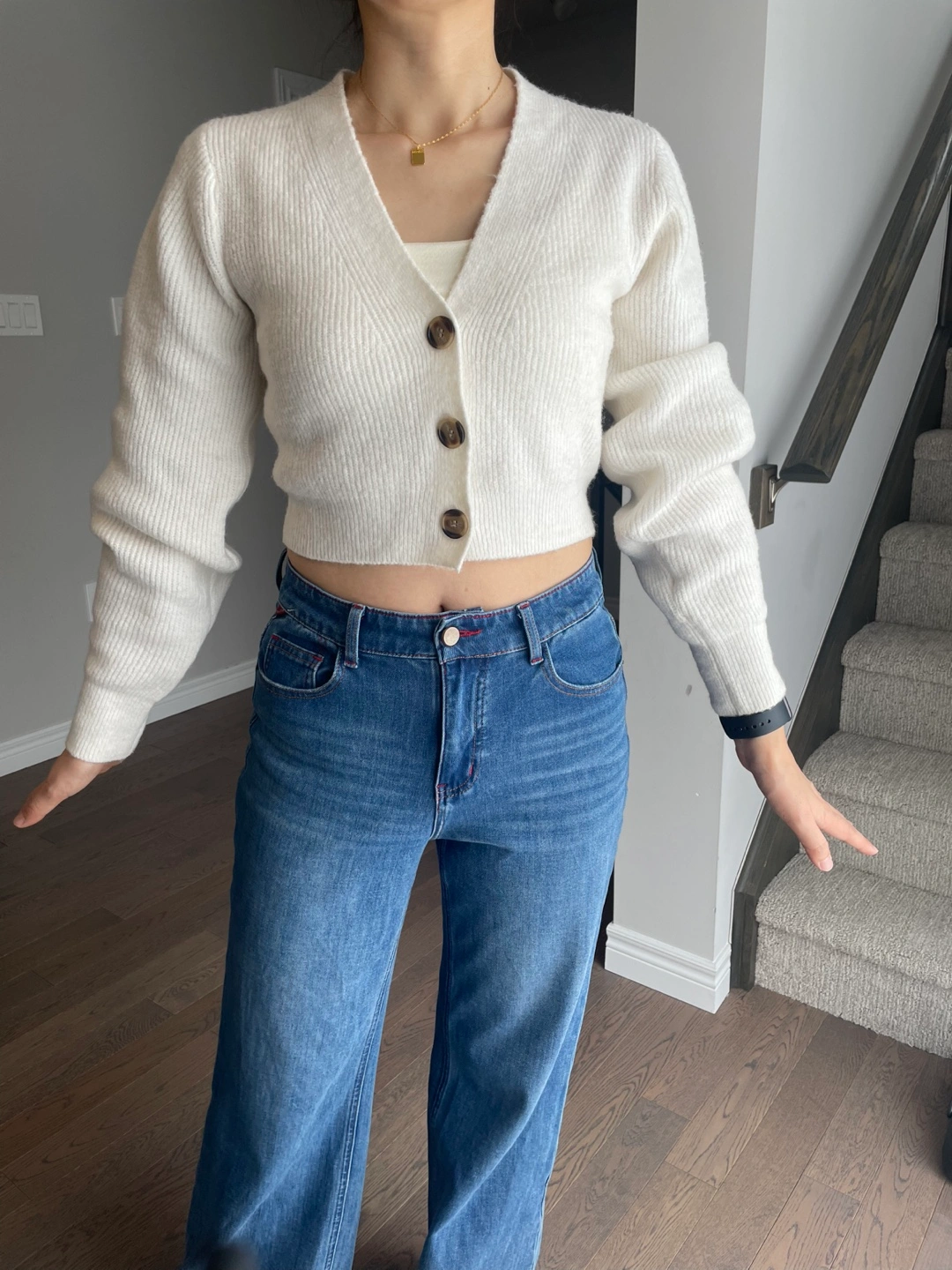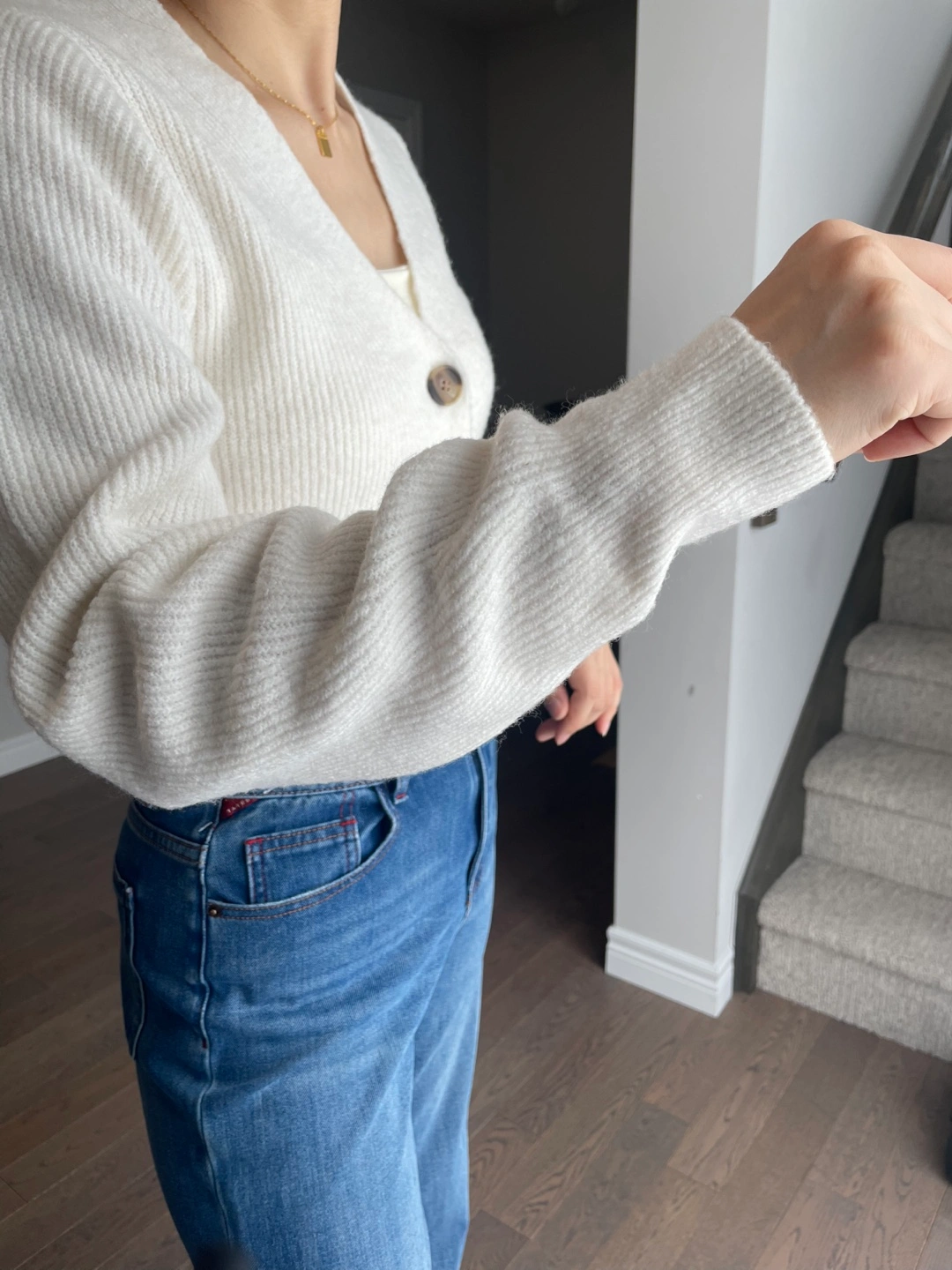 Creamy white ribbed knit cropped cardigan with button front closure. Long sleeves with puffed shoulders. Material feels soft and cozy. It's a stylish layer for any outfit!
