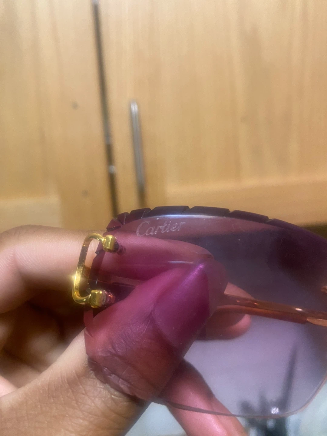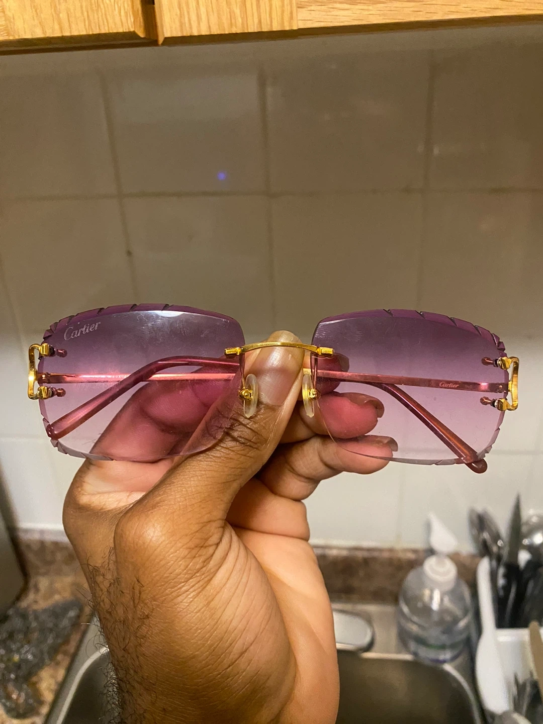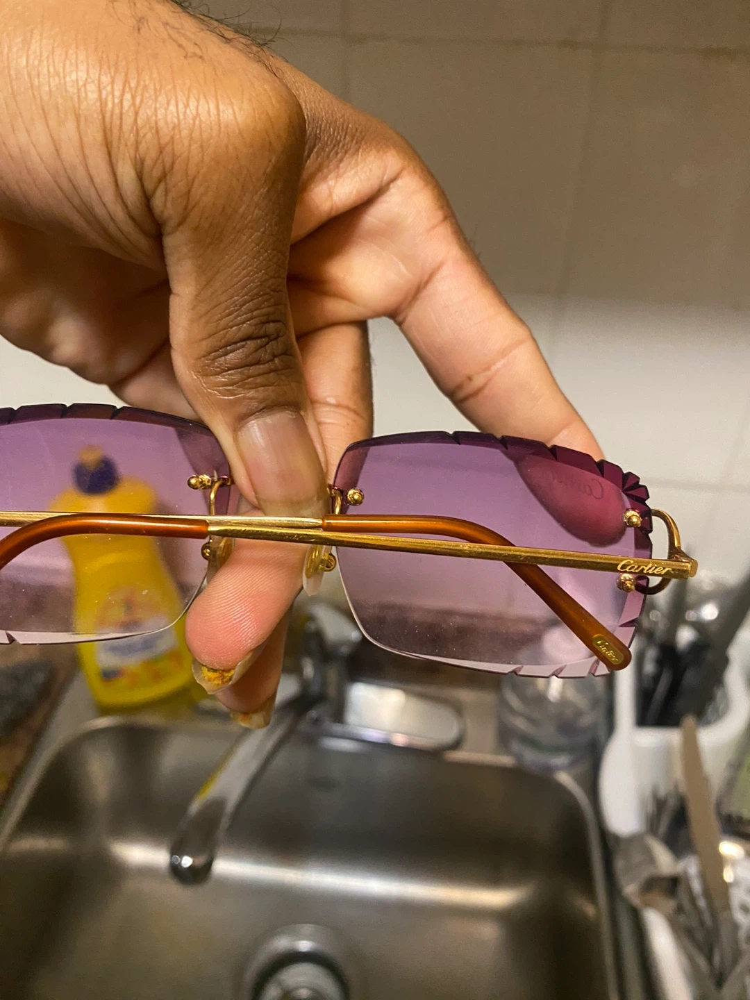 Selling a pair of Cartier sunglasses. They come with the original Cartier case. The sunglasses have a gold frame and purple tinted lenses. Feel free to message me if you're interested!
