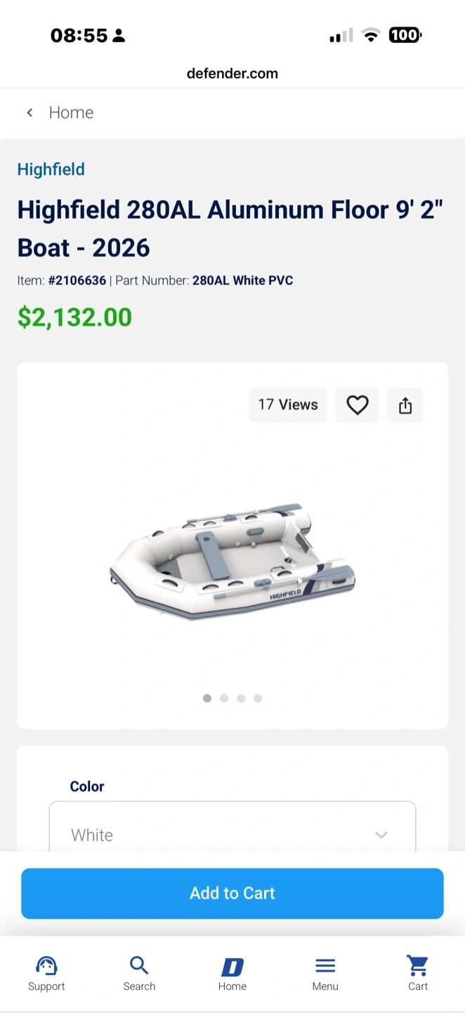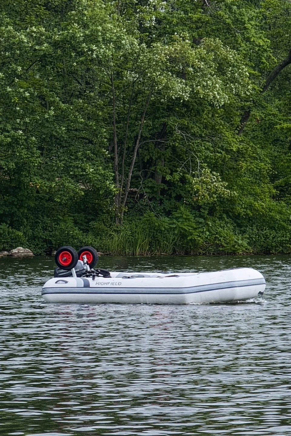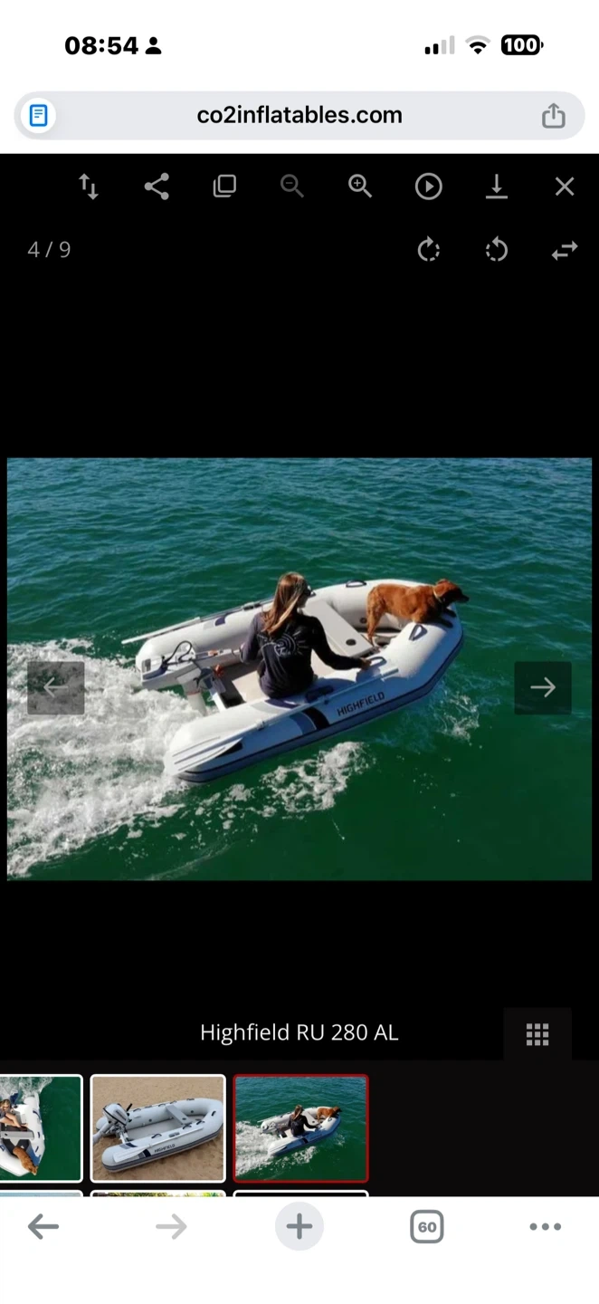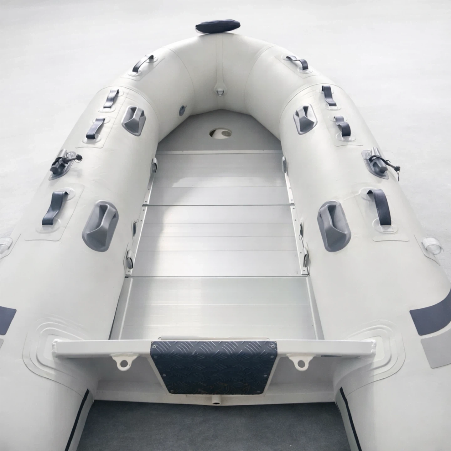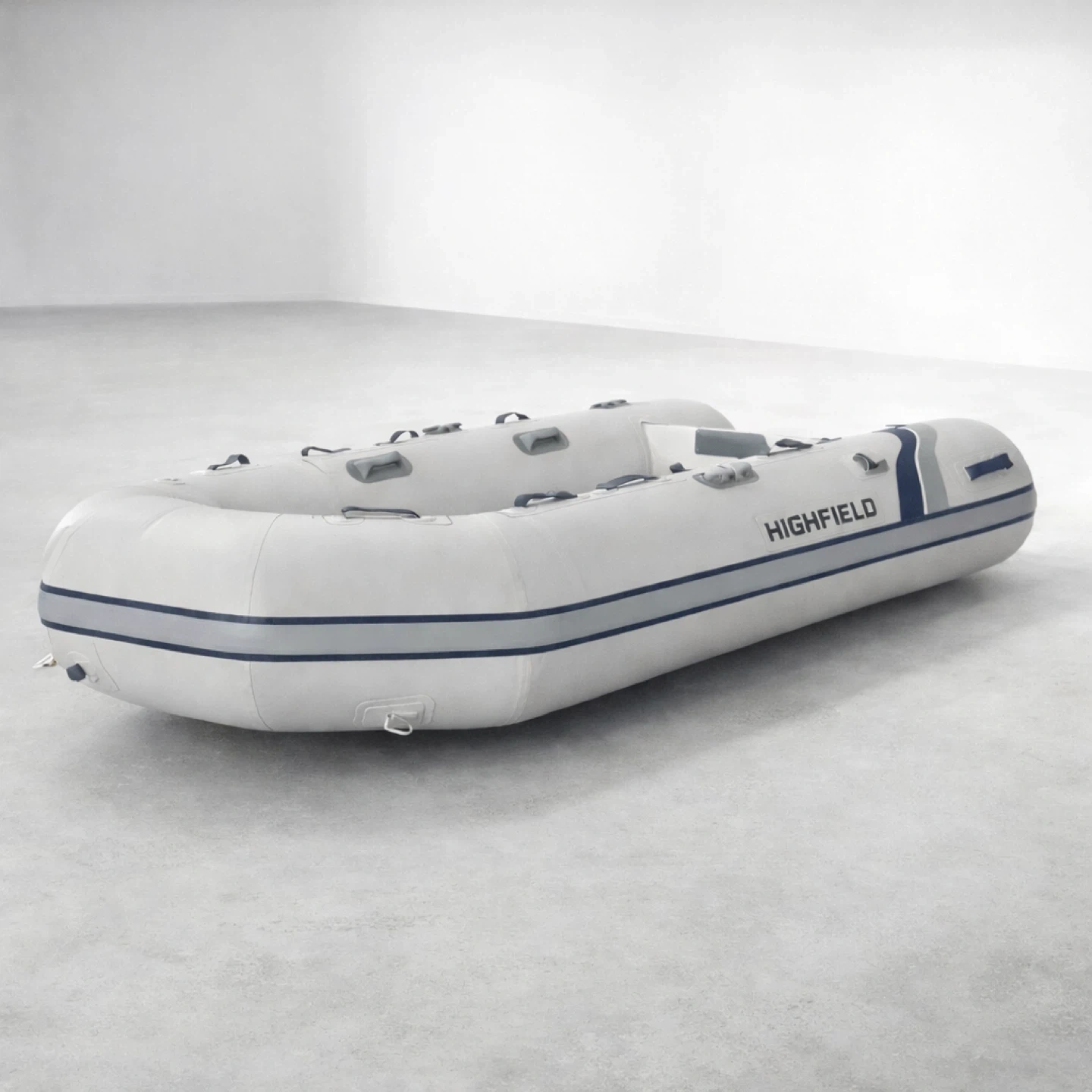 This is a Highfield RU 280 AL inflatable boat. It's made of durable material and includes comfortable grab handles. The aluminum floor provides a sturdy base.