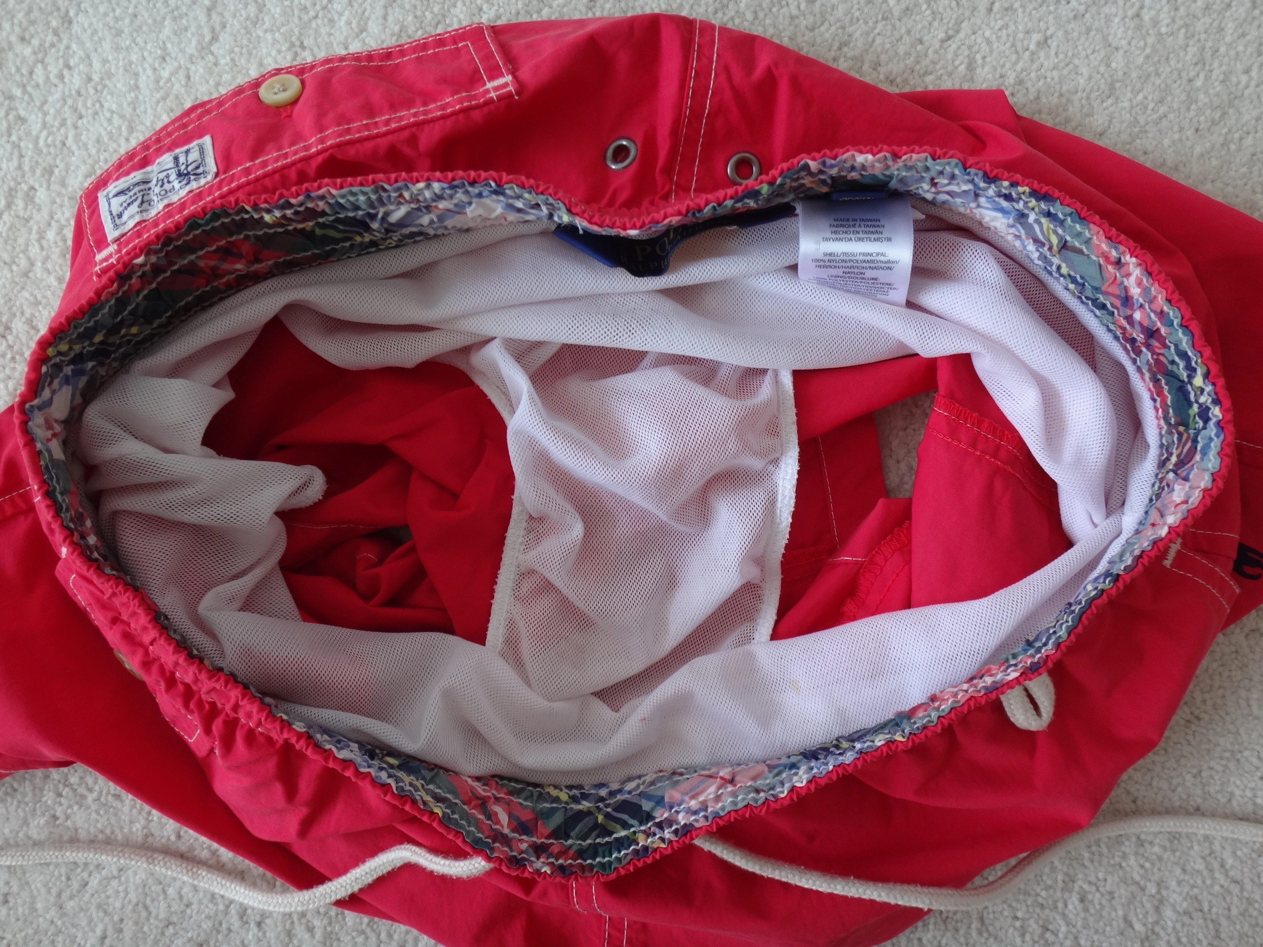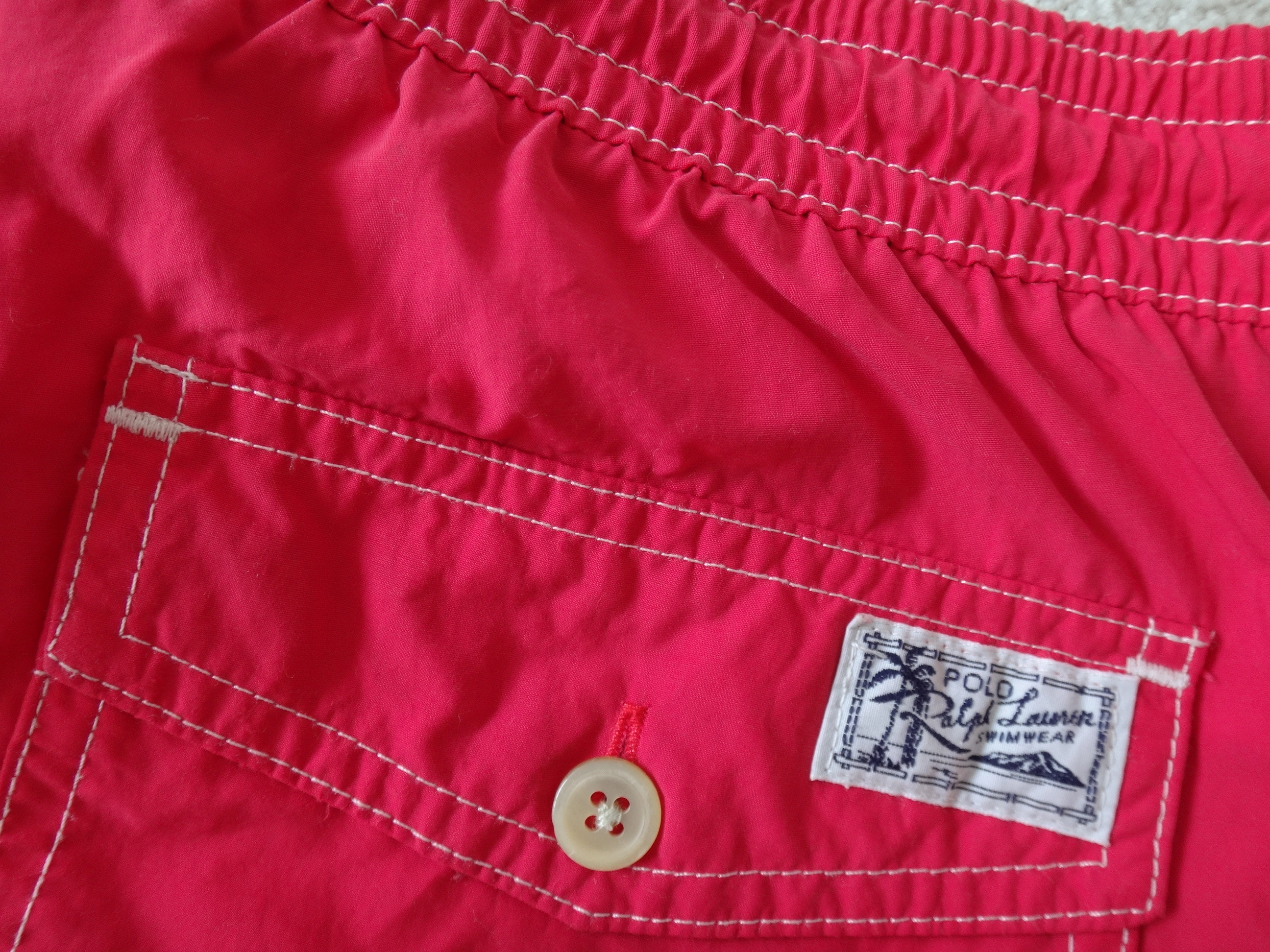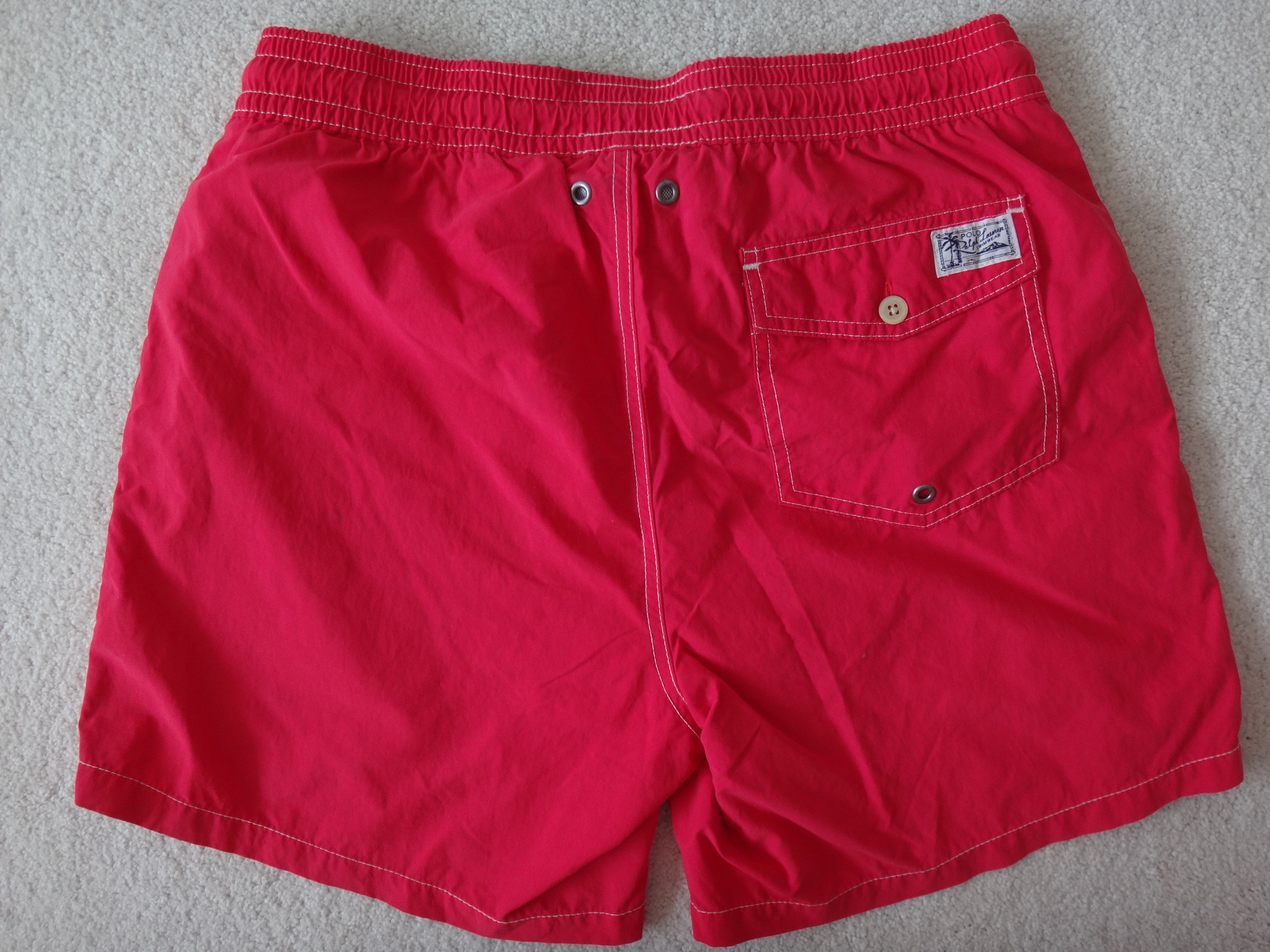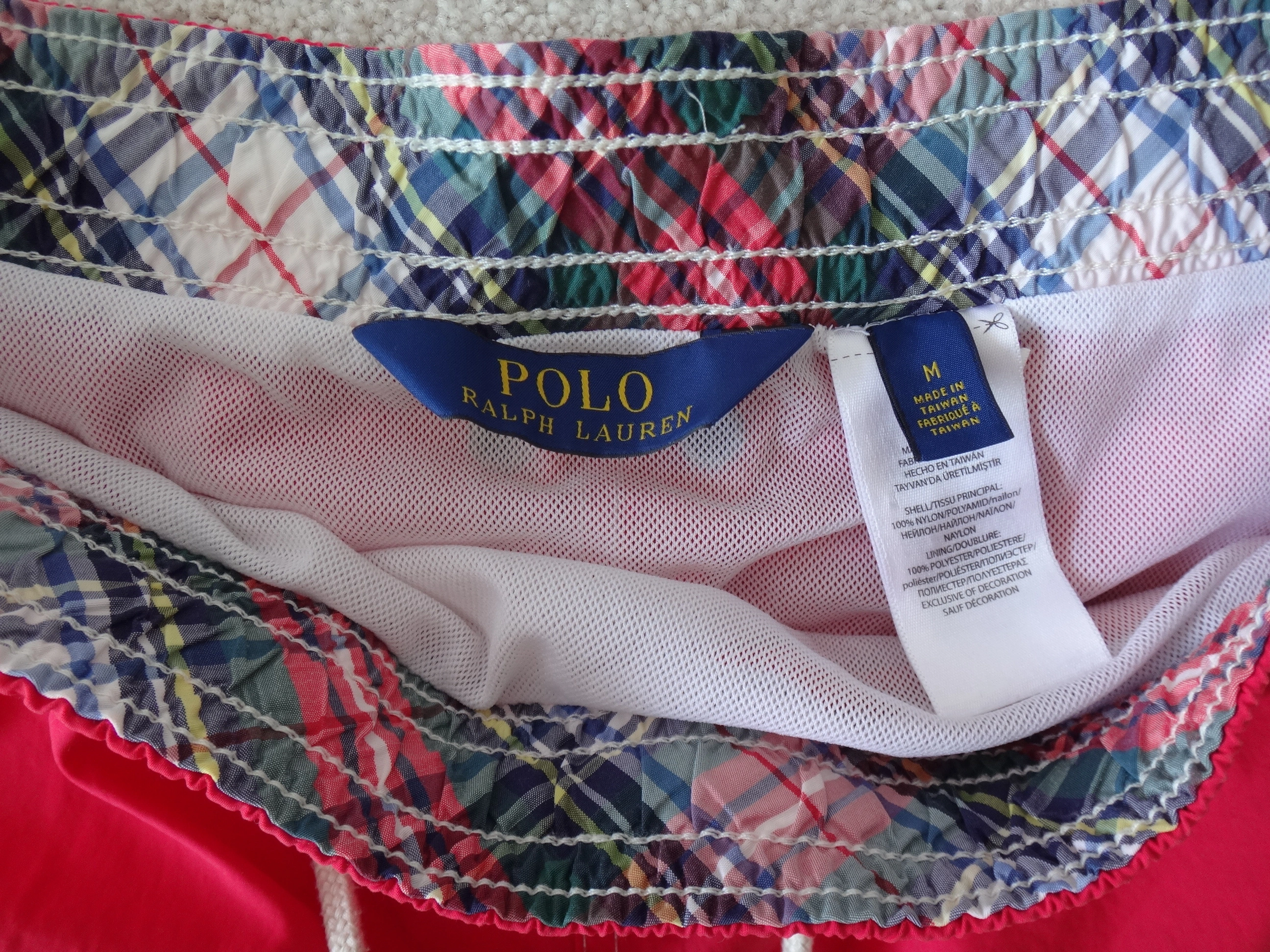 POLO RALPH LAUREN men's medium 31-34 waist size red swim trunks shorts with embroidered dark blue pony logo. 5.75" inseam (length from crotch bottom to shorts bottom) 100% nylon shell.