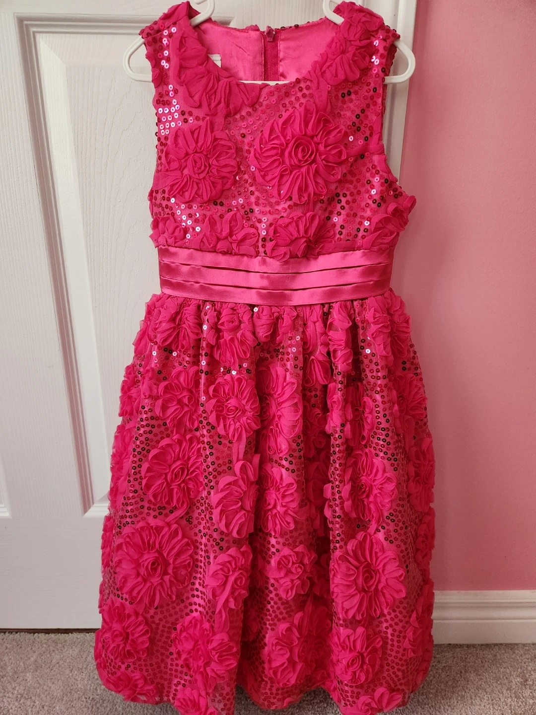 Beautiful sparkly pink party dress! It's covered in sequins and has lovely fabric flower appliqués all over. Features a satin waistband and a zipper closure at the back.