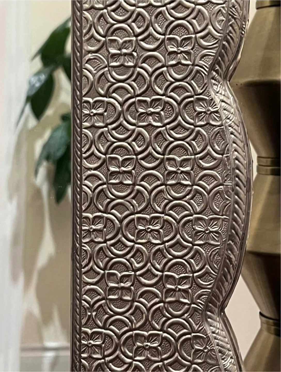 This Gurenstein Home decorative mirror features an intricate embossed frame. Wipe clean only. Mounting hardware is not included.
