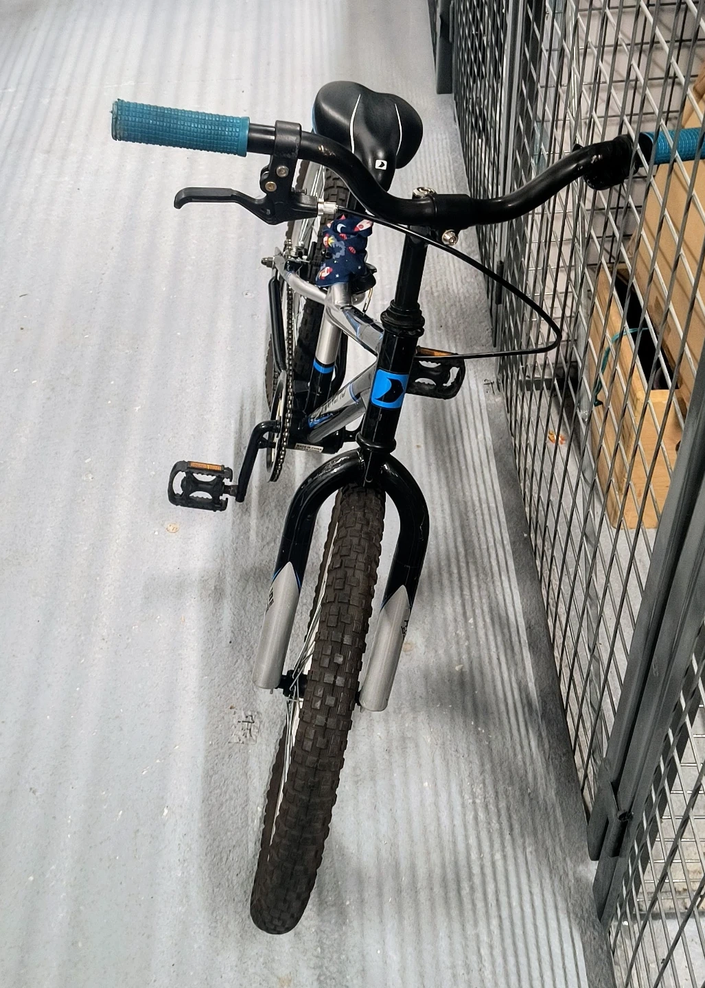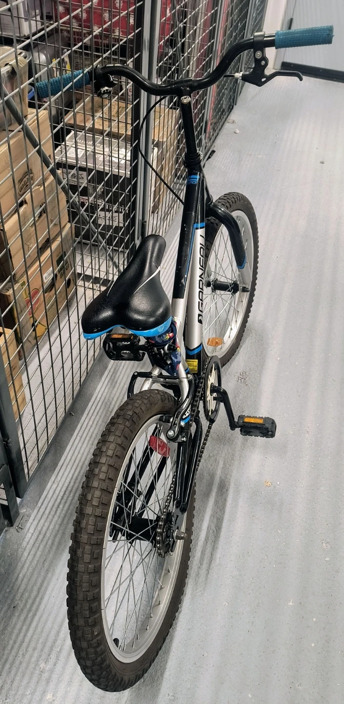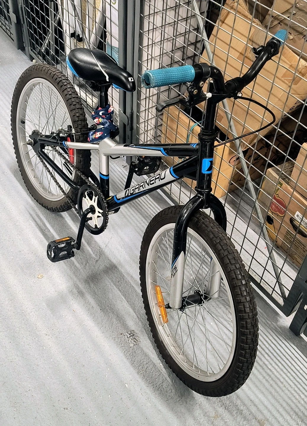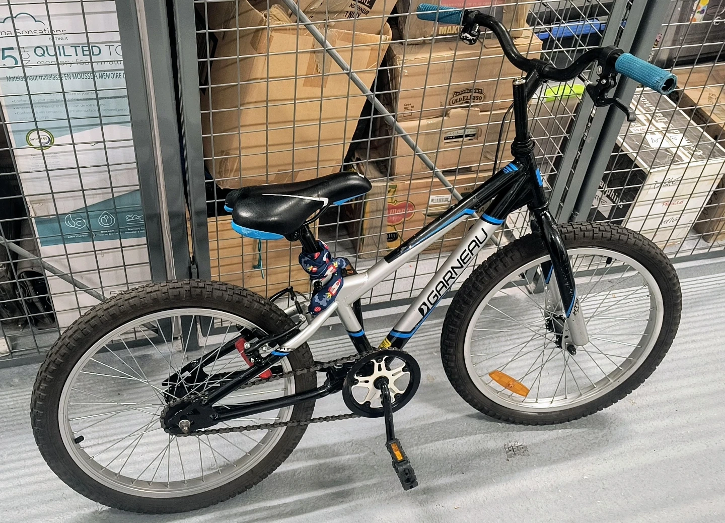 Garneau Junior Bicycle HTS (High-Tensile Steel) with blue handlebars and seat accents. It's suitable for younger riders. This bike has a sturdy frame and reliable braking.
